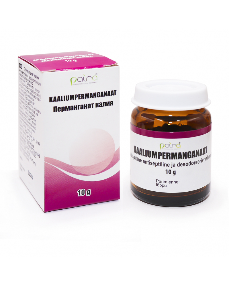 Välispidine antiseptiline ja desodoreeriv vahend. Kasutamisjuhised Kasutatakse 0,01% vesilahusena (helelilla), mis valmistatakse vahetult enne kasutamist. Koostisosade loetelu Kaaliumpermanganaat. Hoiatused ja ettevaatusabinõud Tähelepanu! Pulber on ärritava toimega, vältida pulbri sattumist silma, nahale ja limaskestadele! Vältida kokkupuudet orgaaniliste ainetega (süsi, suhkur, tanniinid). Säilitamisjuhised Hästi suletult ja valguse eest kaitstult. Hoida lastele kättes...