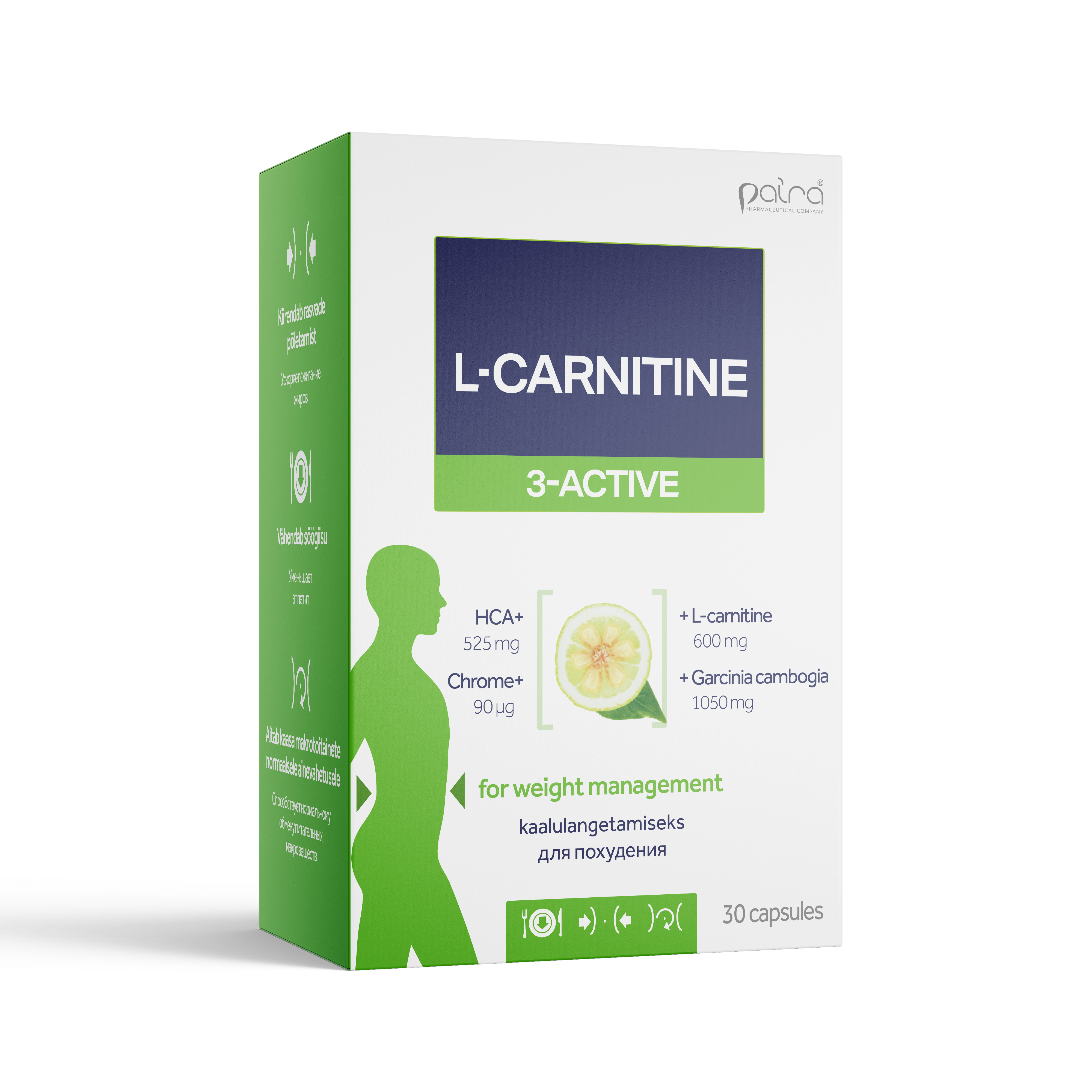 Tootetutvustus L-KARNITIIN 3 aktiiv. Kapslid N30. Toidulisand. Kapslite toime avaldub 3 aktiivaine tõhusas koosmõjus: ▪ L-karnitiin kiirendab rasvade põletamist; ▪ HCA (hüdroksüsidrunhape) aitab vähendada söögiisu ja näksimise vajadust ning takistab süsivesikute muundumist rasvaks; ▪ Kroom aitab kaasa makrotoitainete normaalsele ainevahetusele ja aitab hoida normaalset vereglükoosi taset. Päevaseks tarbimiseks soovitatav kogus ning tarvitamisjuhised täiskasvanutele 1 kapsel 2-3 korda päevas enn...