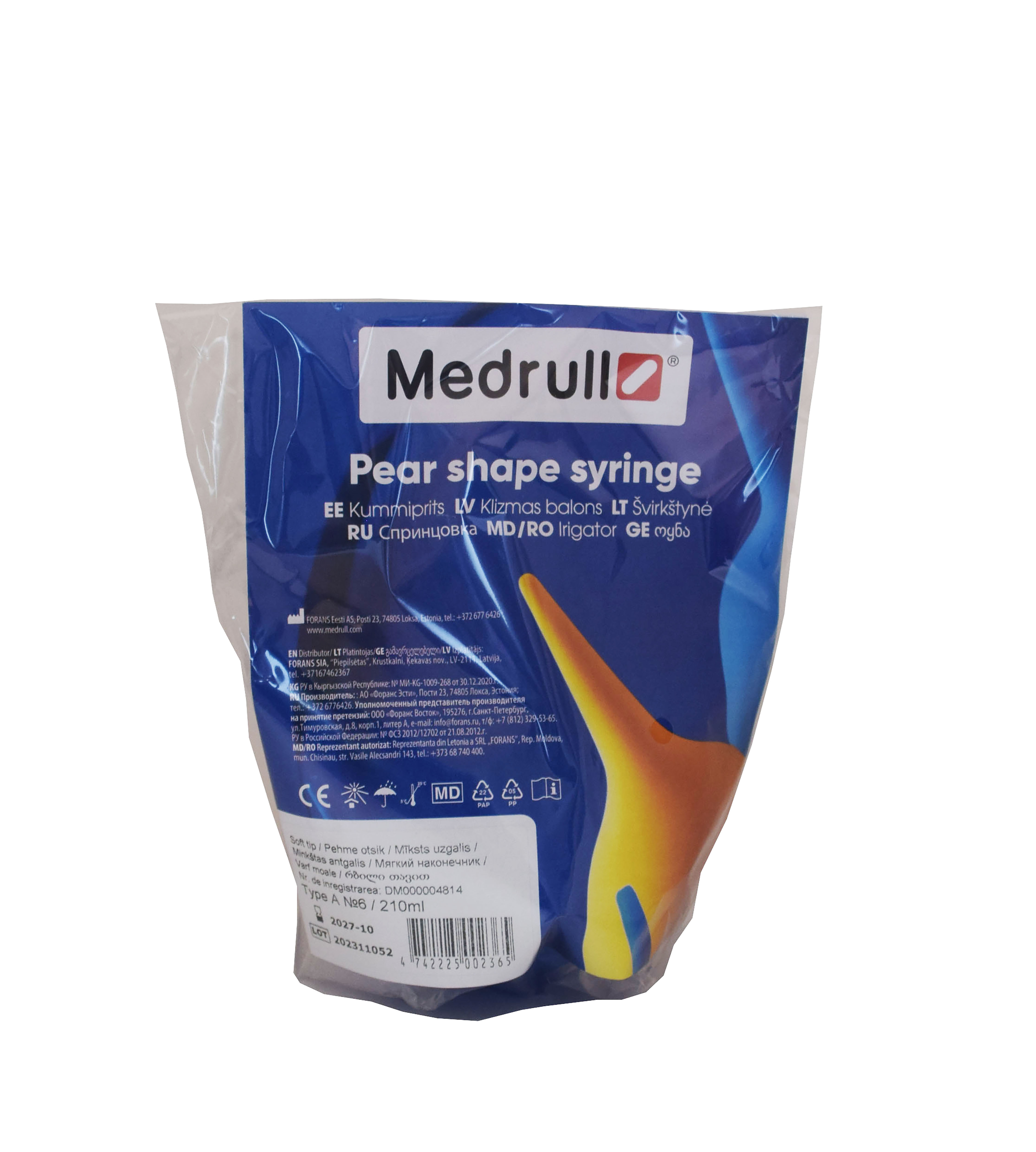 Kasutatakse niisutamiseks ja kehaõõnsustest vedeliku eemaldamiseks. Kummiprits on mõeldud kasutamiseks raviasutustes kui ka kodustes tingimustes. Võib kasutada klistiiri tegemiseks. Pehme otsik. Kasutamisjuhised Enne kasutamist desinfitseerida kummipritsi balloon. Täpsem juhend tootepakendis. Koostisosade loetelu kumm /kumm+ polüpropüleen Hoiatused ja ettevaatusabinõud Kummiprits ei tohi olla otseses kontaktis päikesekiirte, õli , bensiini, happe, leeliste ja teiste aine...