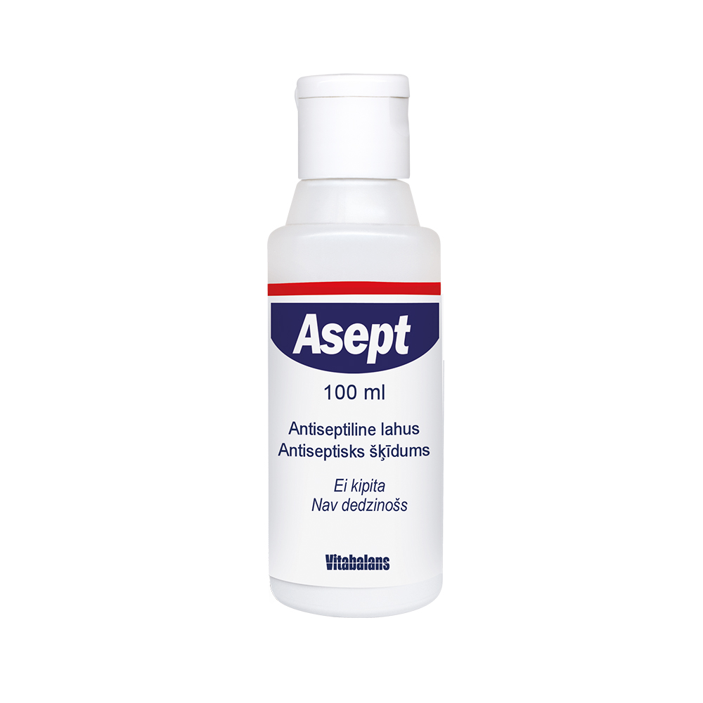 Antiseptiline lahus. Välispidine. Väikeste haavade, nahavigastuste, päikesepõletuste ja putukahammustuste puhastamiseks ja desinfitseerimiseks. Ei tekita kipitust. Kasutamisjuhised Lahjendamata kujul väikeste haavade, nahakahjustuste, päikesepõletuse ja putukahammustuste desinfitseerimiseks. Haavad ja nahavigastused: Peske haava või vigastust ümbritsevat nahka Asepti kastetud vatitampooniga. Loputage vigastatud nahapinda Aseptiga. Putukahammustused ja päikesepõletus: Puh...