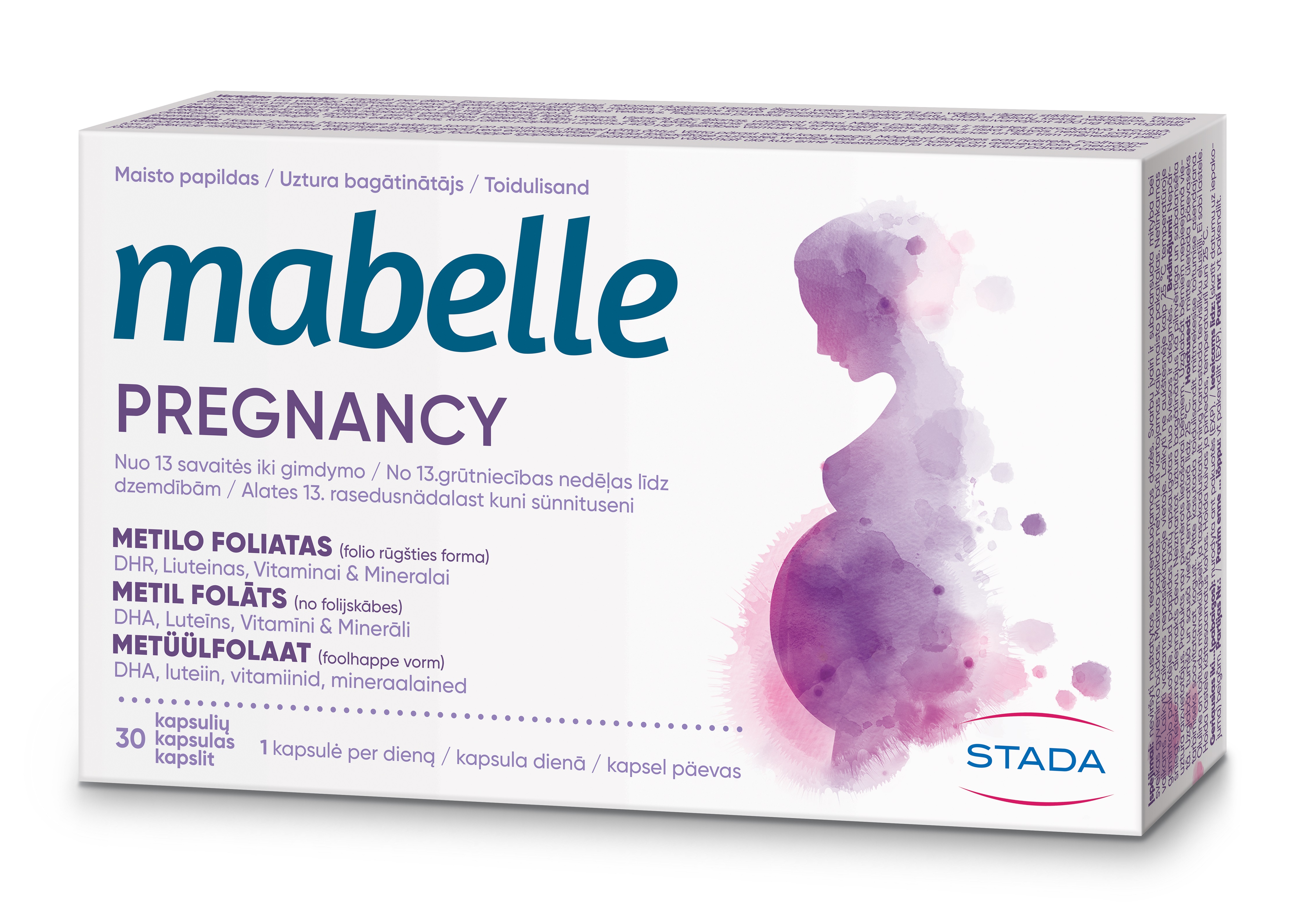 Tootetutvustus MABELLE Pregnancy Toidulisand alates 13. rasedusnädalast kuni sünnituseni METÜÜLFOLAAT (foolhappe vorm) DHA, luteiin, vitamiinid, mineraalained Folaat aitab kaasa kudede kasvule naise organismis raseduse ajal, samuti aitab kaasa normaalsele vereloomele ja osaleb rakujagunemise protsessis. Dokosaheksaeenhape (DHA) aitab säilitada normaalset ajutalitlust. Kasulik toime avaldub siis, kui päevas tarbitakse 250 mg DHA-d. Jood aitab kaasa kilpnäärmehormoonide normaalsele tootmisele ja n...