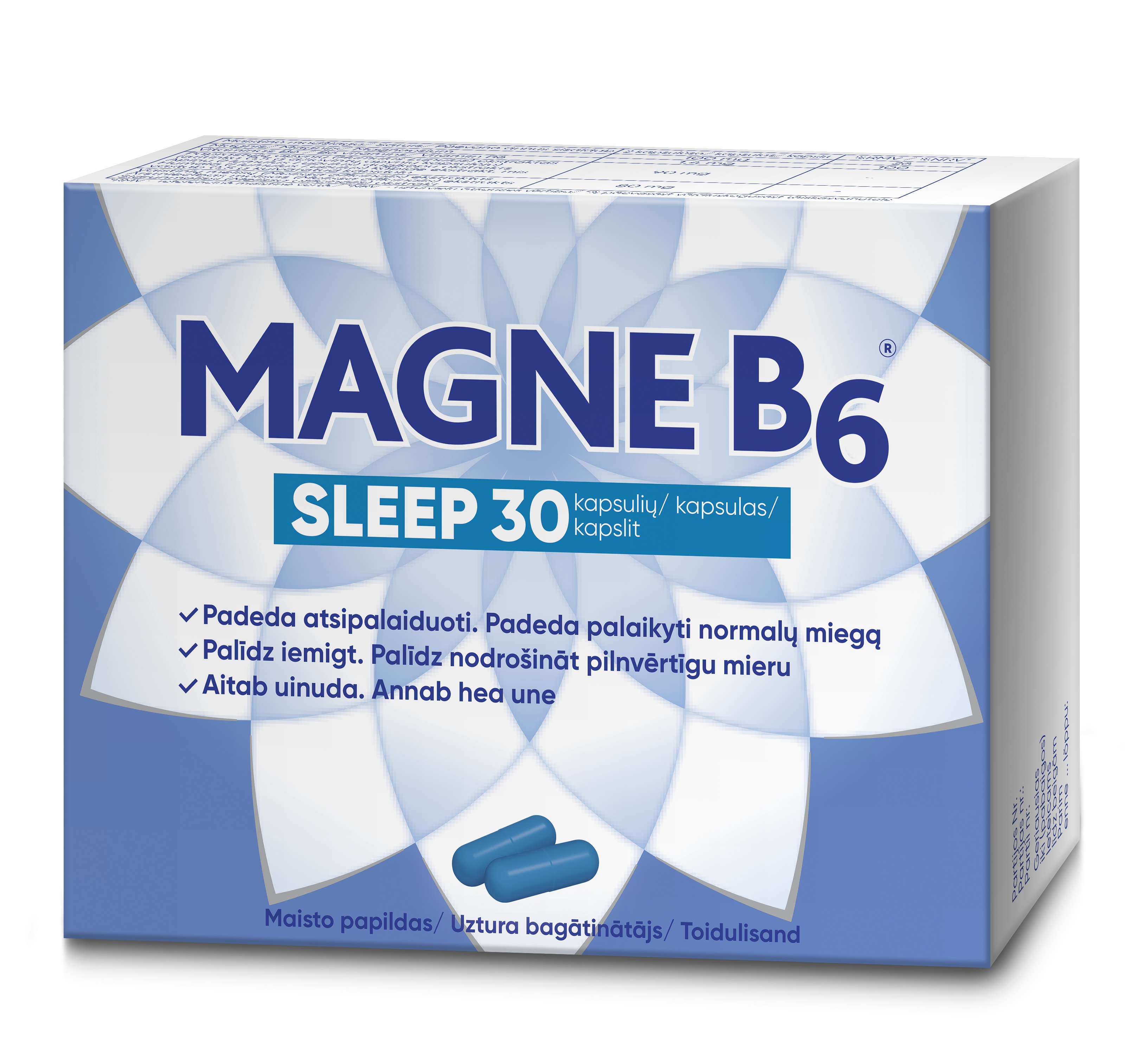 Tootetutvustus Kas Teil on raskusi uinumisega? Tunnete end pärast ärkamist väsinult? Tasakaalu ja tervise tagamiseks on tervendav uni ülioluline. Magne B6 sleep laseb Teil öösiti korralikult välja magada, rahustades meeli ning aidates lõdvestuda. Toode sisaldab valitud taimeekstrakte koos magneesiumi ja B6-vitamiiniga, mis üheskoos parandavad une kvaliteeti ja aitavad uinuda: -Humalal on meeli lõdvestav ja füüsilist heaolu toetav toime. Annab sügava ja tervisliku une. -Sidrunmeliss aitab lõdvest...