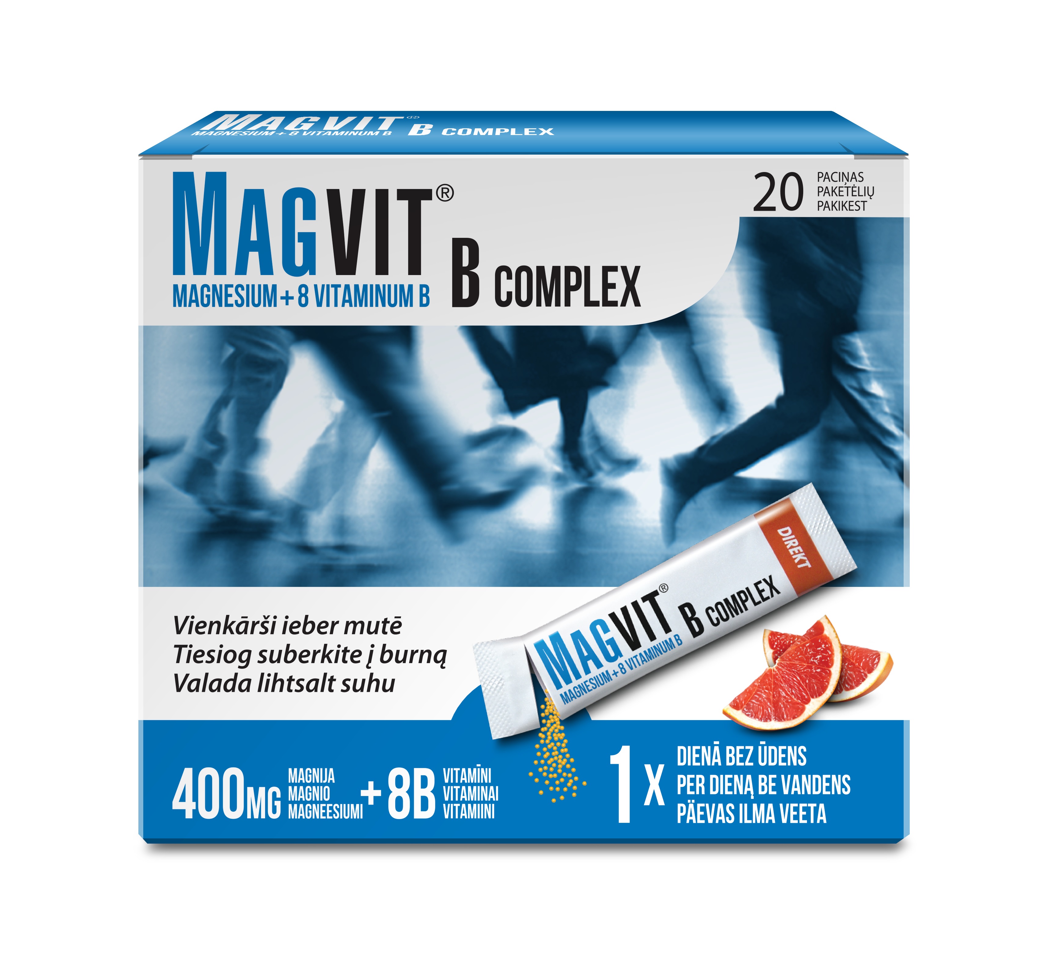 Tootetutvustus MAGVIT® B complex graanulid N20 Toidulisand. Sobib organismi kiireks ning lihtsaks varustamiseks magneesiumi ja oluliste B-vitamiinidega, näiteks füüsilise koormuse korral. Sobib aktiivsele, tervislikke eluviise harrastavale tarbijale, kes armastab mugavust, ei ole hinnatundlik ja hindab kvaliteeti. Magneesium, vitamiinid B2, B6, niatsiin, pantoteenhape, foolhape ja B12 aitavad vähendada väsimust ja kurnatust. Magneesium, vitamiinid B1, B6, niatsiin ja biotiin aitavad kaasa närvis...