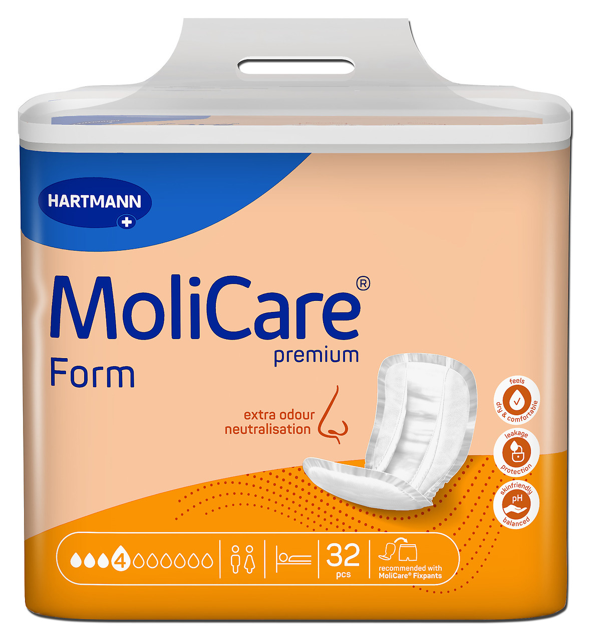 Vormmähe väga raskele pidamatusele. Pehmest tekstiilisarnasest materjalist välispind. Nahasõbralik vedelikku jaotav pealiskiht. Lõhnaneutraliseerijat sisaldav kolmekihiline imav osa. Sisemised lekkekindlad barjäärid. Anatoomiline kuju ja elastsed krooked tagavad mähkme väga hea istuvuse. Niiskuse indikaator: kui mähkme välisküljel olev märgistus hajub, on aeg mähet vahetada. Vormmähkmed püsivad kindlalt paigal ja on eriti diskreetsed kui neid kinnitada MoliCare Fixpants ...