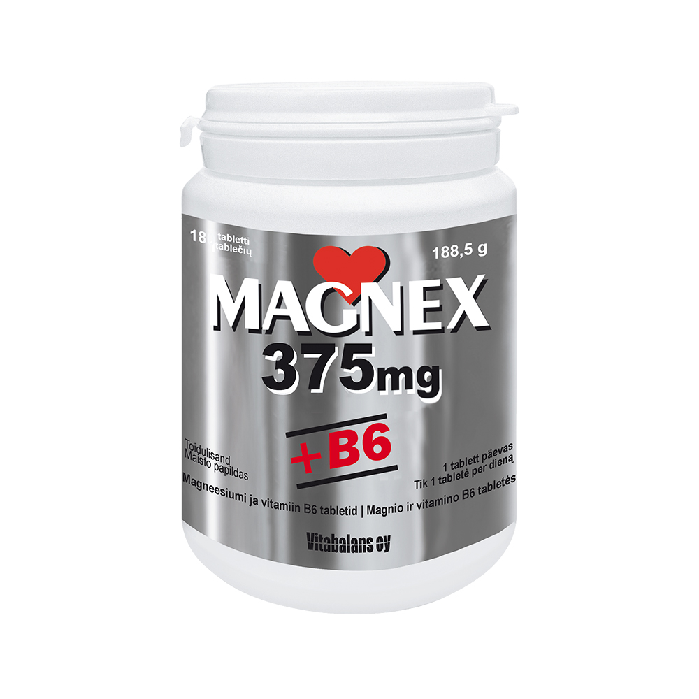 Tootetutvustus Toidulisand. Magneesium aitab kaasa närvisüsteemi normaalsele talitlusele ja normaalsele lihaste tööle. Magneesium ja Vitamiin B6 aitavad vähendada väsimust ja kurnatust ning aitavad kaasa normaalsetele psühholoogilistele funktsioonidele. Päevaseks tarbimiseks soovitatav kogus ning tarvitamisjuhised Täiskasvanutele 1 tablett päevas. Tablett tuleb neelata tervelt piisava hulga vedelikuga. Sisaldus päevase annuse kohta 1 tablett sisaldab: Magneesiumi 375 mg (100%*), B6- vitamiini 2,...