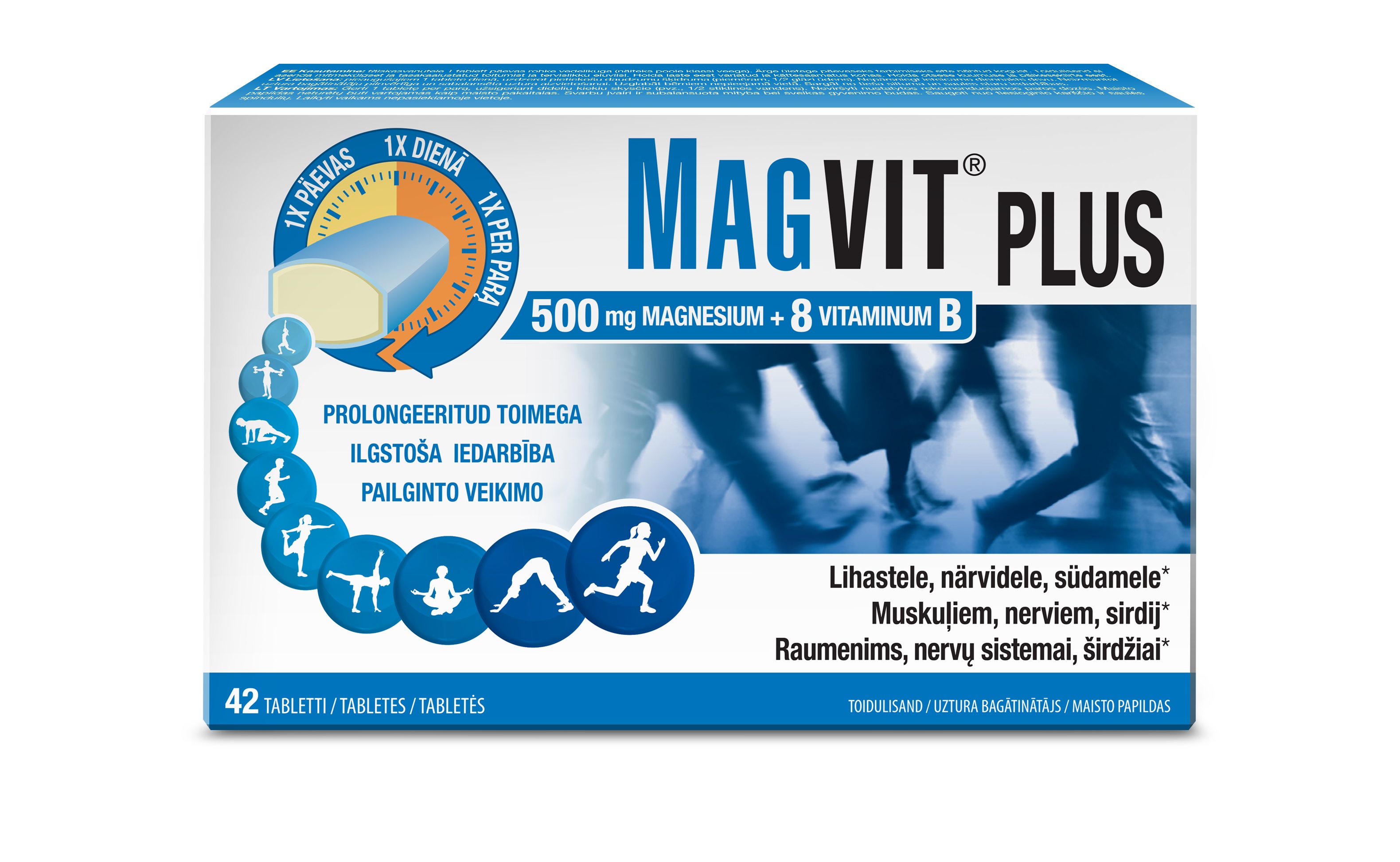Tootetutvustus Toidulisand magneesiumi ja B-rühma vitamiinide kompleksiga. Magvit PLUS magneesiumiga toetab lihaskonna funktsiooni ja kombinatsioonis vitamiinidega B2, B6 ja B12 aitab kaasa närvisüsteemi normaalsele talitlusele. Magneesium, biotiin ja niatsiin toetavad ainevahetust ja närvisüsteemi normaalset talitlust. Tiamiin aitab kaasa normaalsele südametalitlusele. Magneesium ja vitamiin B12 aitavad vähendada väsimust ja kurnatust. Eriline pikatoimeline depoo vabastab toitaineid ja magneesi...