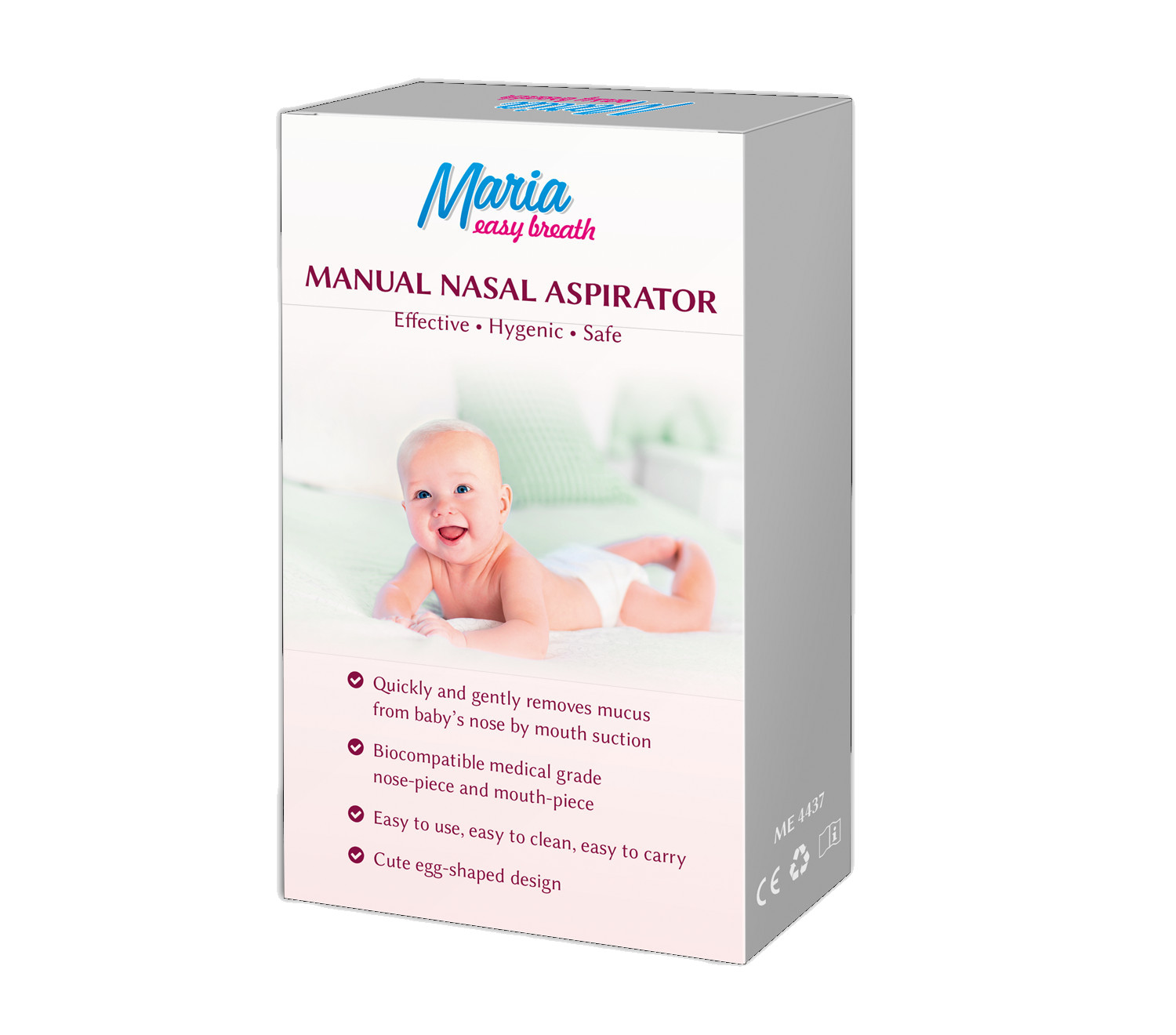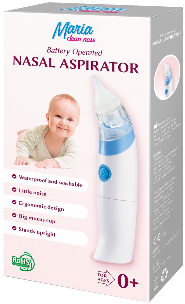 Maria Clean Nose - ninaaspiraator, mis töötab 2AA patareidega (patareid ei kuulu komplekti). Eemaldab kiiresti ja õrnalt lima lapse ninakäikudest, kergendab hingamist. Ei vaja lisatarvikuid. Veekindel ja pestav, vaikne, pestav konteiner lima jaoks, 2 silikoonotsikut. Kasutamisjuhised Enne kasutamist lugege hoolikalt kasutusjuhendit. 1. Valige silikoonist otsik vastavalt patsiendi ninasõõrme suurusele. 2. Veenduge, et silikoonist otsik on kindlalt kinnitatud kogumistopsil...