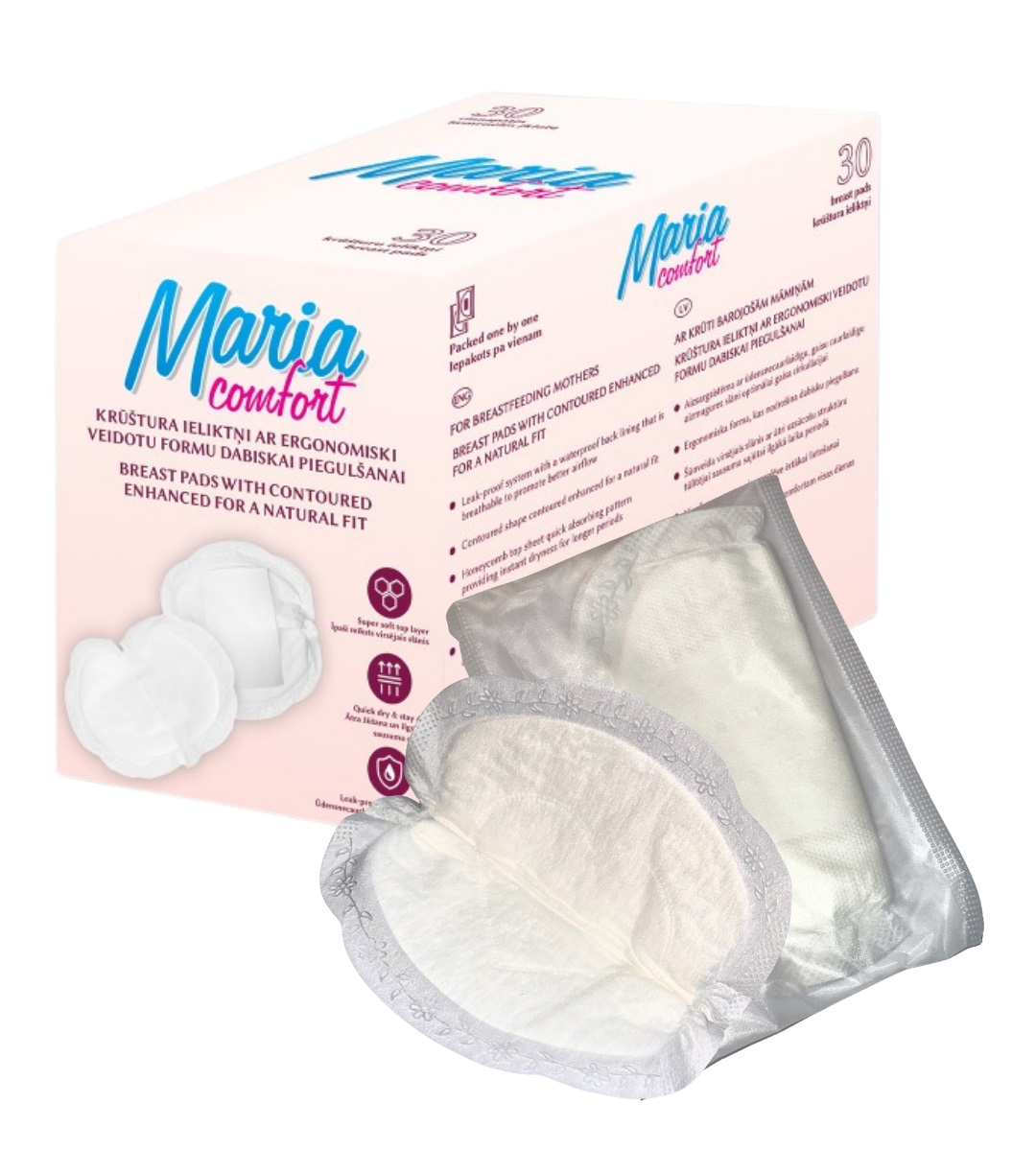 Õhku läbilaskvad rinnapadjad imetavale emale. Lekkevaba süsteem. Veekindlad, kuid hingava tagakihiga, mis soodustab paremat õhuvoolu. Anatoomiline kuju loomuliku mugavuse jaoks. Kärgstruktuuriga pealispind. Kiiresti imav pind tagab kohese kuivuse pikemaks ajaks. Pakitud ükshaaval, mis teeb mugavaks nende kaasavõtmise. Koostisosade loetelu Mittekootud materjal, fluff-mass, superabsorbentne polümeer, siidipaber, hingav PE-kile, kuumliim, trükipaber, kummiriba Netokogus 30 ...