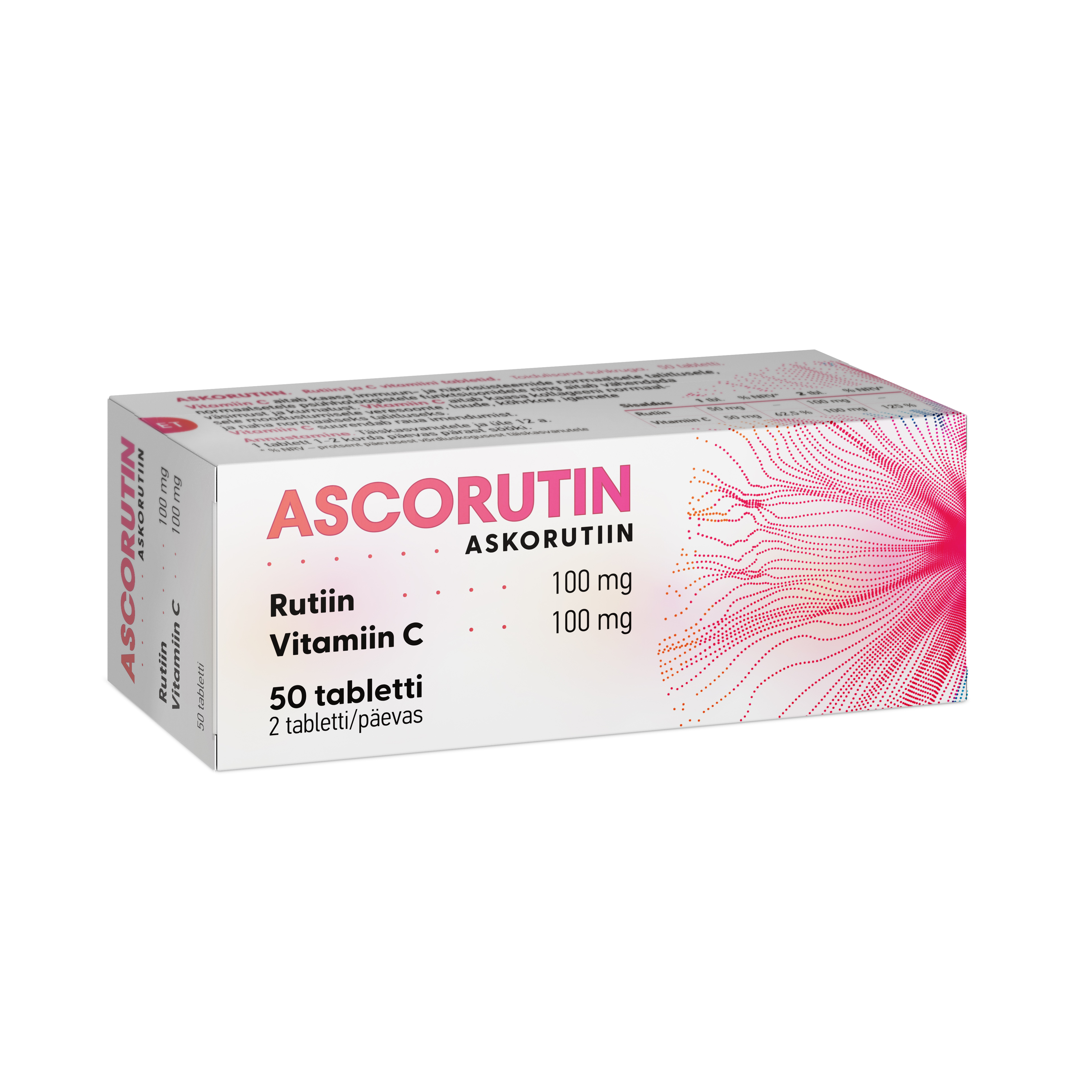 Tootetutvustus Askorutiin. Rutiini ja C vitamiini tabletid. Toidulisand suhkruga. 50 tabletti. Vitamiin C aitab kaasa immuun- ja närvisüsteemide normaalsele talitlusele, normaalsetele psühholoogistele funktsioonidele ning aitab vähendada väsimust ja kurnatust. Vitamiin C aitab kaasa kollageeni normaalsele moodustumisele veresoonte, luude, kõhrkoe, igemete ja naha normaalseks talitluseks. Vitamiin C suurendab raua imendumist. Päevaseks tarbimiseks soovitatav kogus ning tarvitamisjuhised Täiskasva...