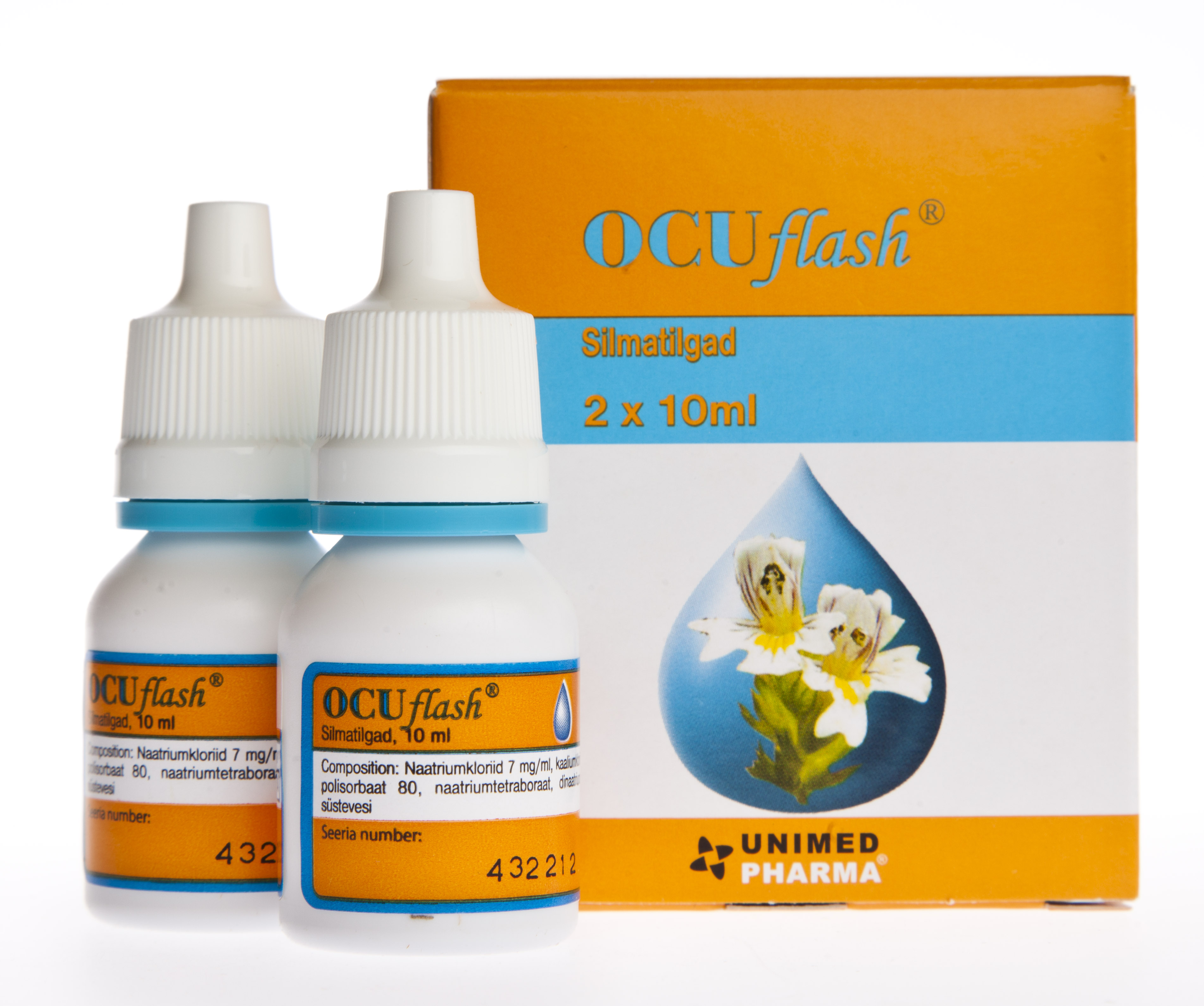 OCUflash® silmatilgad on isotooniline loputuslahus, mis sisaldab abiainena silmarohu (Euphrasia officinalis) ekstrakti. Silmarohuekstraktil on põletikuvastased, desinfitseerivad ja kokkutõmbavad omadused. Neid silmarohu omadusi kasutatakse silmade rahustamiseks, mitteinfektsioosse ripsmete ja sidekesta põletiku ennetamiseks ja toetavaks raviks. OCUflash® silmatilgad on mõeldud ärritavate osakeste, kemikaalide ja võõrkehade silmast välja loputamiseks, silma loputamiseks s...