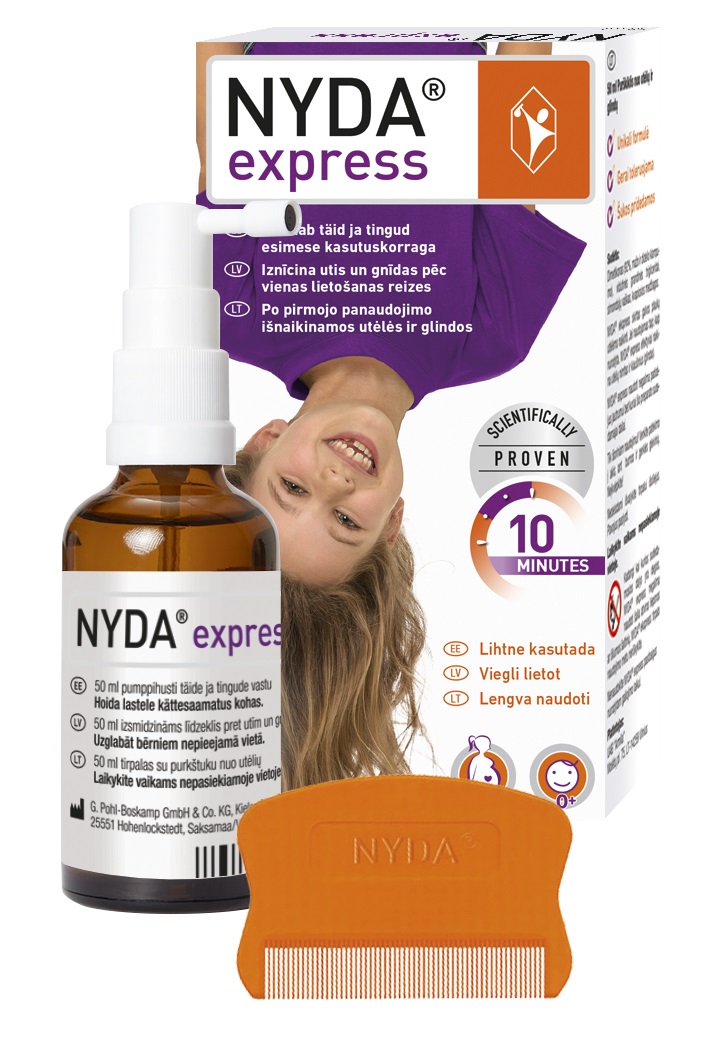 Täid peas? NYDA express aitab! "Peatäid" - juba ainuüksi seda sõna kuuldes hakkab paljudel pea sügelema. Täinakkuse võib saada igaüks, sõltumata soost, vanusest, rikkusest või vaesusest. On olemas lahendus, kuidas ohutult ja efektiivselt nende tüütute parasiitidega võidelda. NYDA express sisaldab silikoonõli dimetikooni, mis hävitab täi kõik kolm arenguastet - tingu, noortäi ja täi. Juustesse pihustatud dimetikoon tungib tänu oma füüsikalistele omadustele täi hingamissüs...