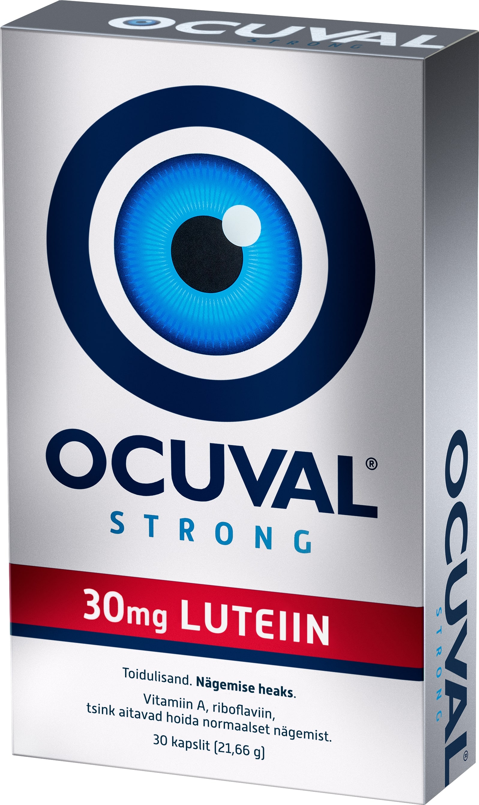 Tootetutvustus OCUVAL® STRONG Toidulisand. Nägemise heaks. Ocuval Strong - Omega-3 rasvhapete, kuni 30 mg luteiini, A-, B2-vitamiini ja tsinki sisaldav toidulisand silmadele. A-vitamiin, riboflaviin, tsink aitavad säilitada normaalset nägemist. Ocuval Strongi on soovitatav kasutada kui nägemine halveneb, kui töötatakse palju arvutiga. Veedetakse palju aega televiisorit vaadates või lugedes, kui tehakse suurt püüdlikkust ja täpsust nõudvat tööd. Tuntakse silmade väsimust ja kui esinevad kuiva sil...