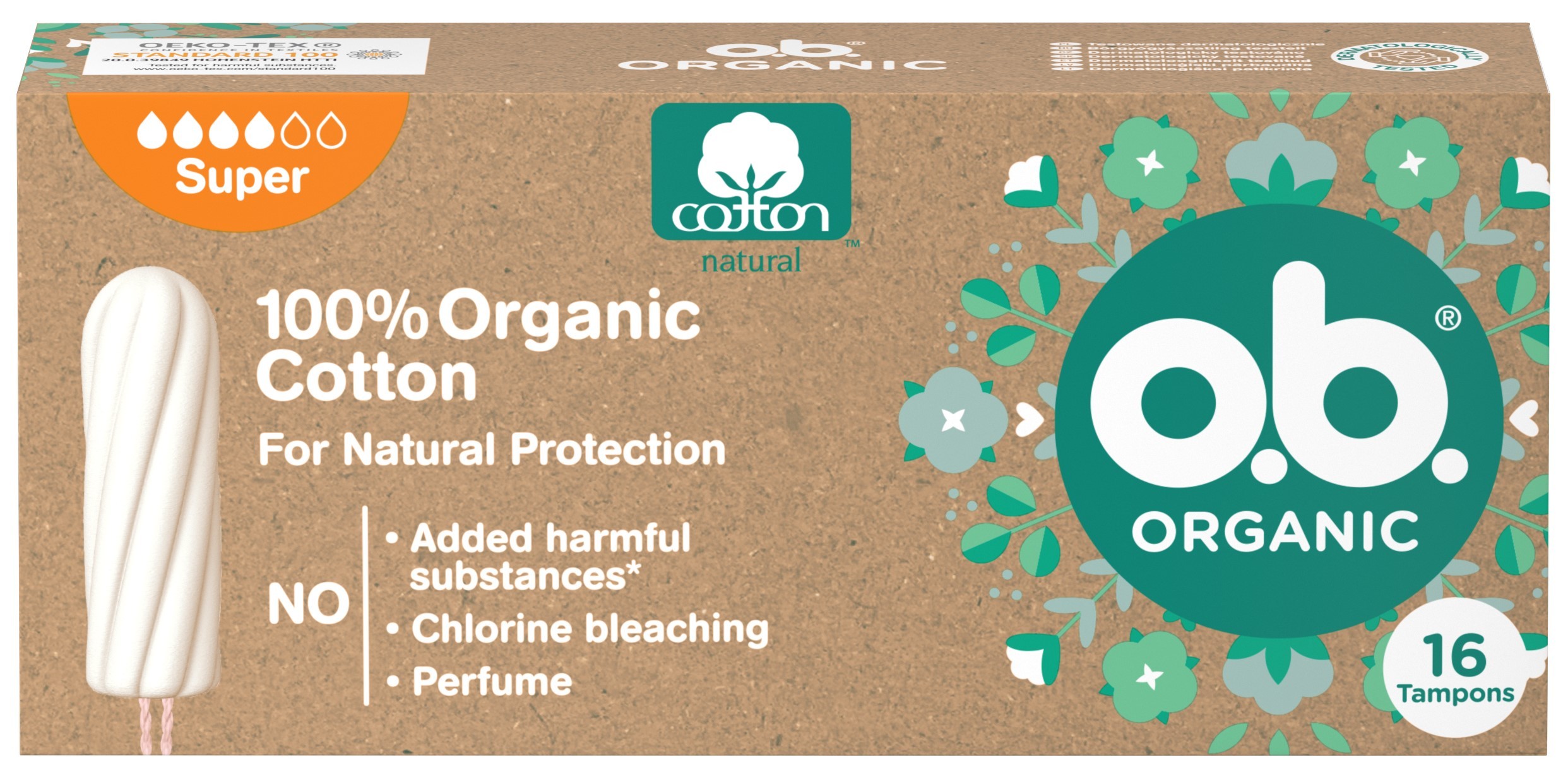 o.b.® Organic tampoonid on valmistatud 100% sertifitseeritud orgaanilisest puuvillast. Nii tampoon kui ka nöör on plastivabad. Ilma lisatud kahjulike ühendite* ja lõhnaaineteta, klooriga pleegitamata. Ainulaadsete kumerate soontega tampoon usaldusväärseks kaitseks. Super tampoonid sobivad tugeva vooluse korral. Dermatoloogiliselt testitud, hüpoallergeenne. *Global Organic Textile Standard alusel testitud ja heaks kiidetud Kasutamisjuhised Vali tampoon, mis vastab kõige p...