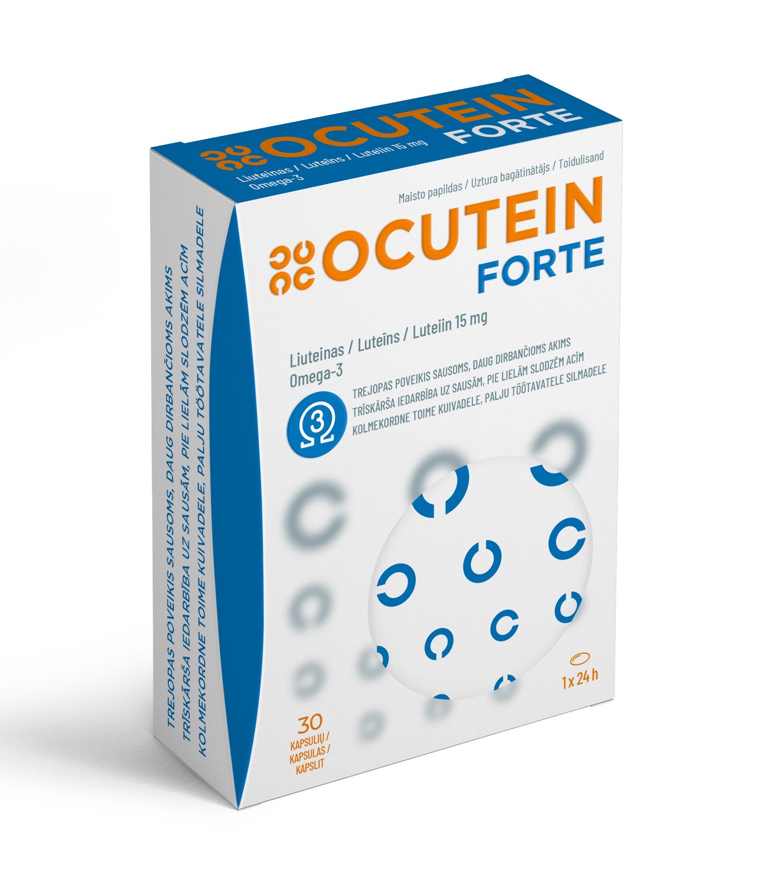 Tootetutvustus OCUTEIN FORTE Luteiin 15mg kapslid aitavad: - vähendada silmade väsimust; - parandada nägemisteravust; - kaitsta silma võrkkesta rakke. OCUTEIN FORTE sisaldab 3 kompleksi: - Karotenoidkompleks (Luteiin 15mg + Zeaksantiin+ Beetakaroteen); - Oomega-3 polüküllastamata rasvhapped (DHA+EPA); - Antioksüdantkompleks (VitamiinC+ VitamiinE+Vask+Tsink+Seleen). Miks just Ocutein Forte? OCUTEIN FORTE Luteiin 15mg on väga mõjus ja hea profülaktiline preparaat võrkkesta degeneratiivsete muutust...