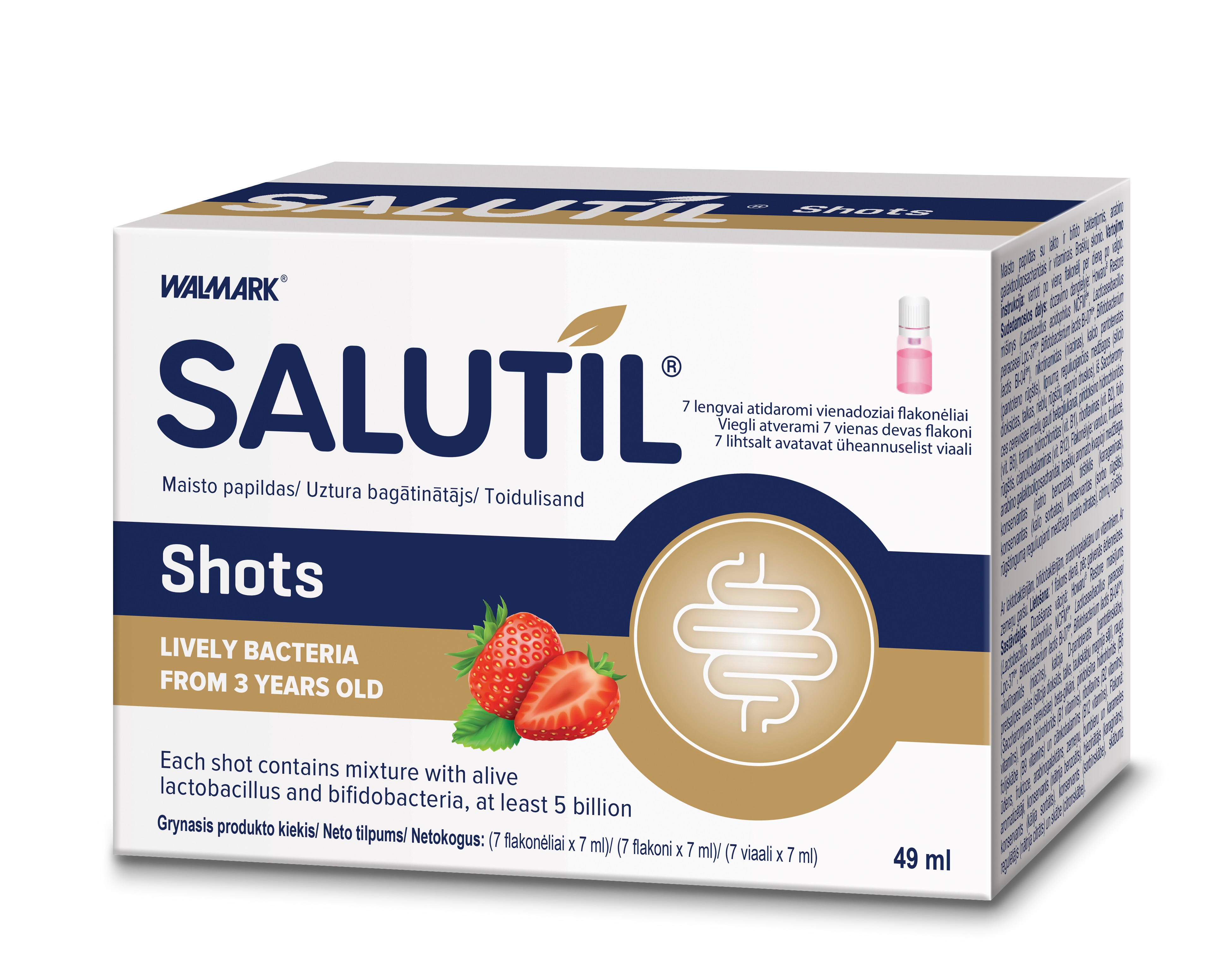 Tootetutvustus Salutil shots maasikamaitseline N7 Toidulisand, probiootikumid, prebiootikumid ja vitamiinid ühes viaalis! Alates 3. eluaastast. Iga viaal sisaldab segu, milles on elusad laktobatsillid ja bifidobakterid, vähemalt 5 miljardit. Maasikamaitseline. 7 lihtsalt avatavat üheannuselist viaali. Gluteenivaba. Sobib laktoositalumatuse korral. Päevaseks tarbimiseks soovitatav kogus ning tarvitamisjuhised Alates 3. eluaastast. Annustamine: 1 viaal päevas pärast põhitoidukorda. Maasikamaitseli...