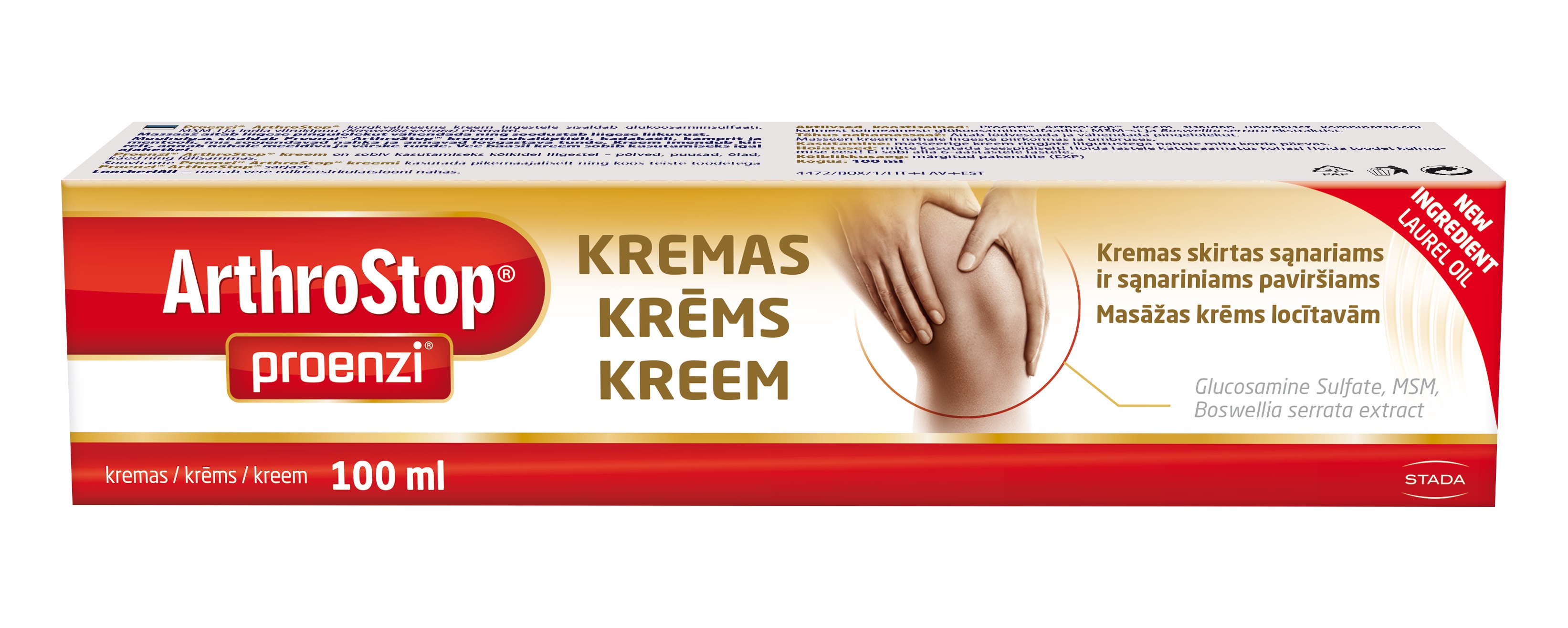 Proenzi® ArthroStop® kreem 100ml Proenzi® ArthroStop® kõrgkvaliteetne kreem liigestele sisaldab glükoosamiinsulfaati, MSM-i ja India viirukipuu (Boswellia serrata) ekstrakti. Massaaz aitab liigese pingulolekut vähendada ning soodustab liigese liikuvust. Muuhulgas sisaldab Proenzi® ArthroStop® kreem eukalüptiõli, kadakaõli, kamprit ja mentooli, mis soojendavad nahka ja annavad lõõgastava tunde. Kreem imendub kiirelt, annab nahale meeldiva ja värske tunde. Vee baasil kreem...