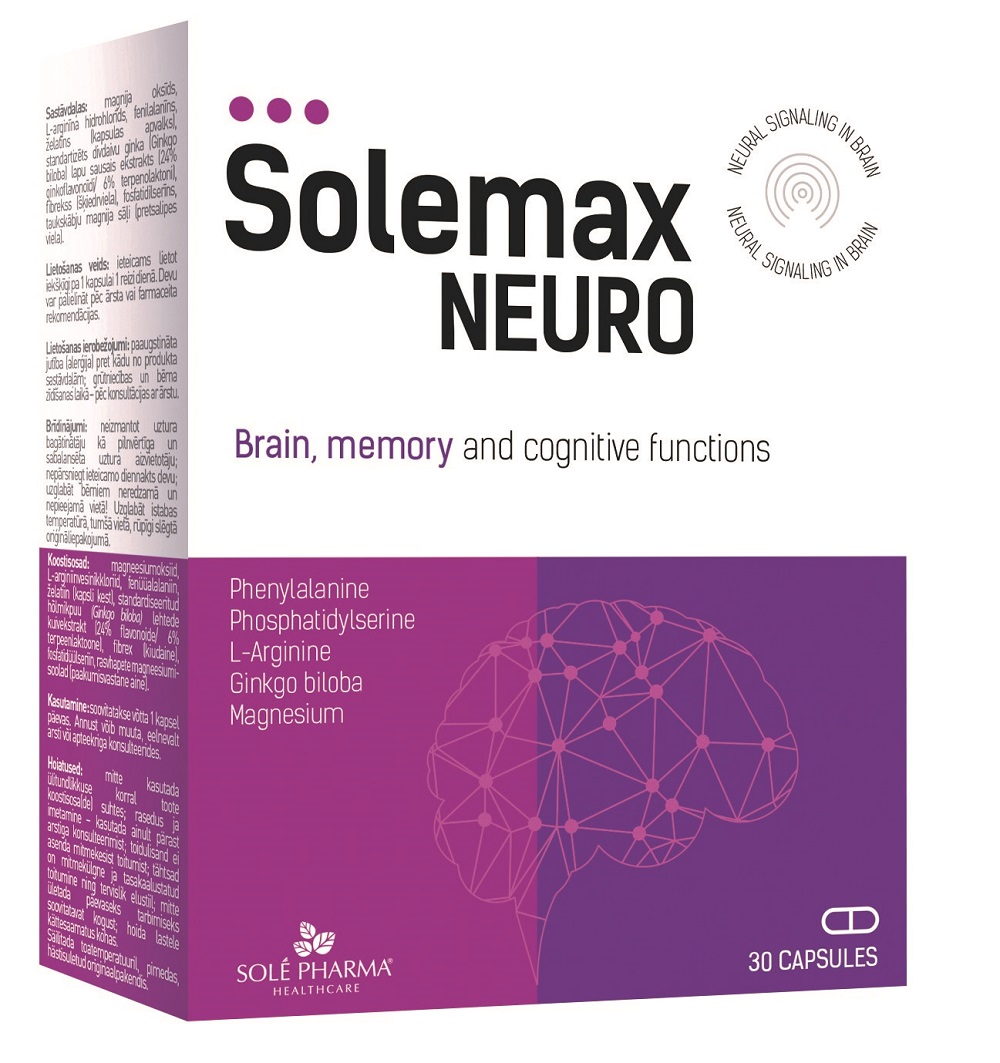 Tootetutvustus Solemax Neuro kapslid Toidulisand 30 kapslit Solemax Neuro on uudne bioloogiliselt aktiivsete ainete kompleks ajutegevusele ja mälule. Hõlmikpuu lehtede ekstrakt toetab ajutegevust, mälu, keskendumisvõimet ja kognitiivseid funktsioone ning soodustab aju ja jäsemete vereringet. Magneesium aitab kaasa normaalsele närvisüsteemi ja lihaste talitlusele ning elektrolüütide tasakaalule, samuti aitab vähendada väsimust ja kurnatust. Päevaseks tarbimiseks soovitatav kogus ning tarvitamisju...