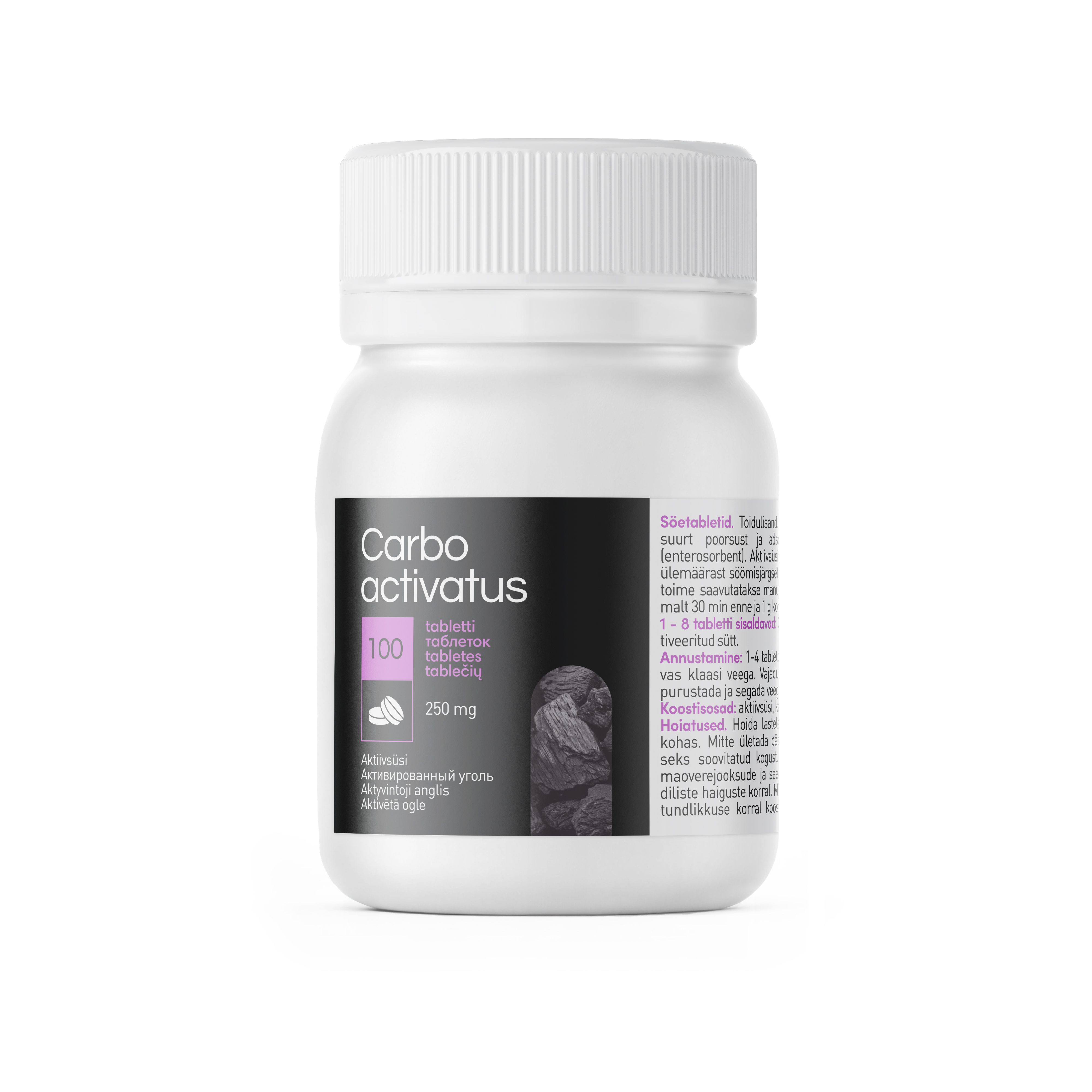 Tootetutvustus Söetabletid. Toidulisand. Aktiivsüsi omab suurt poorsust ja adsorbeerimisvõimet (enterosorbent). Aktiivsüsi aitab vähendada ülemäärast söömisjärgset puhitust (kasulik toime saavutatakse manustades 1g vähemalt 30 min enne ja 1g kohe pärast sööki). Päevaseks tarbimiseks soovitatav kogus ning tarvitamisjuhised Annustamine: 1-4 tabletti 1-2 korda päevas klaasi veega. Vajadusel võib tablette purustada ja segada veega. Sisaldus päevase annuse kohta 1 - 8 tabletti sisaldavad: 250 mg – 2 ...