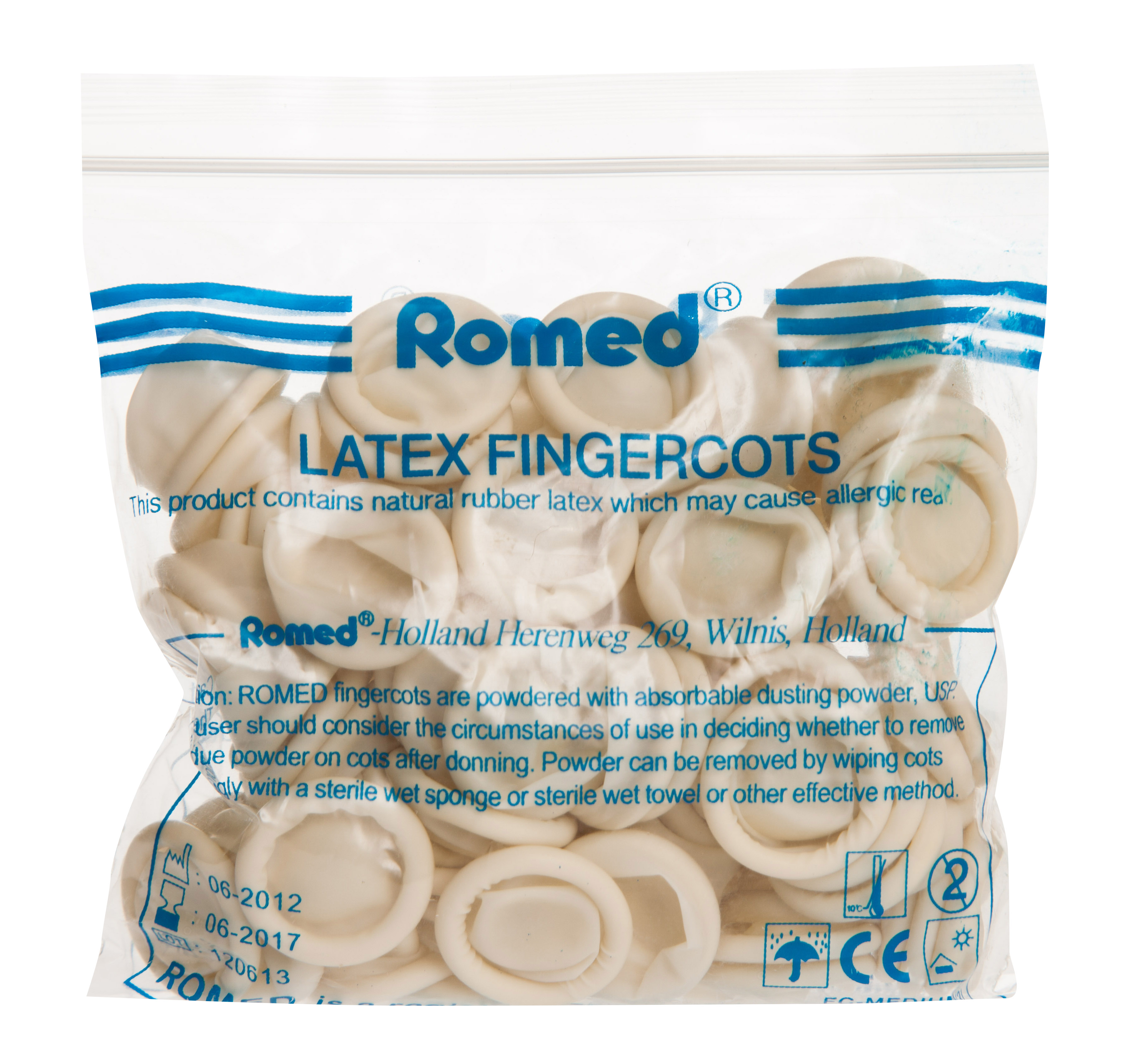Lateksist sõrmekaitsed, suurus M. Kasutamisjuhised ROMED sõrmeotsad on kaetud imenduva talgiga. Kasutaja peab sõltuvalt asjaoludest otsustama, kas eemaldab talgi või ei. Talkpulbrit saab eemaldada pühkides sõrmeotsa katet steriilse märja käsna või rätikuga või kasutada mõnda muud efektiivset meetodit. Hoiatused ja ettevaatusabinõud Mitte kasutada kui esineb ülitundlikkust lateksi vastu. Seadme ja pakendi sisu 100 tk. Tootja või tootja volitatud esindaja Tootja: VAN OOSTV...