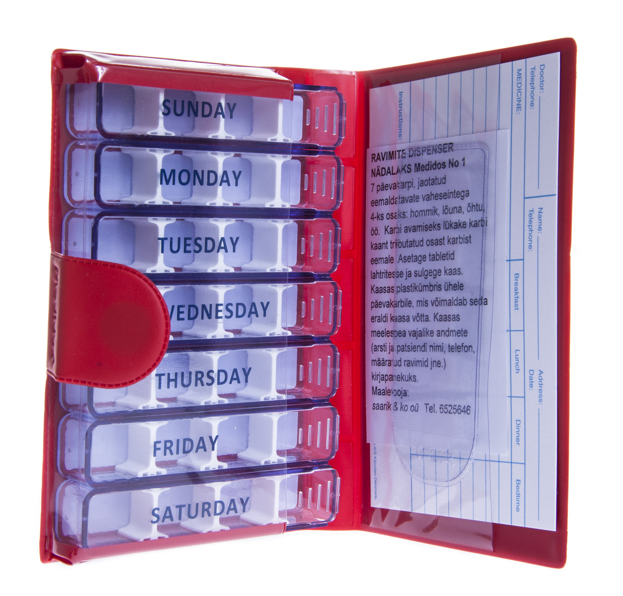Nädalakarp neile, kes võtavad päevas 1-2 tabletti. Jaotatud vaheseintega 7-ks osaks: pühapäev, esmaspäev, teisipäev, kolmapäev, neljapäev, reede, laupäev. Karbi vaheseinad on liigutatavad, lahtri suurus sobitatav tablettide arvule. Kaasas ümbris karbile. Karbi põhjale võib pliiatsiga kirjutada. Pestav nõudepesumasinas temperatuuril 55 kraadi. Mõõdud: 9,5 x 2 x 1,5 cm. Maaletooja: Saarik & KO OÜ, Akadeemia tee 33, Tallinn, Eesti. Tel 6525646. Kasutamisjuhised Karbi avamis...