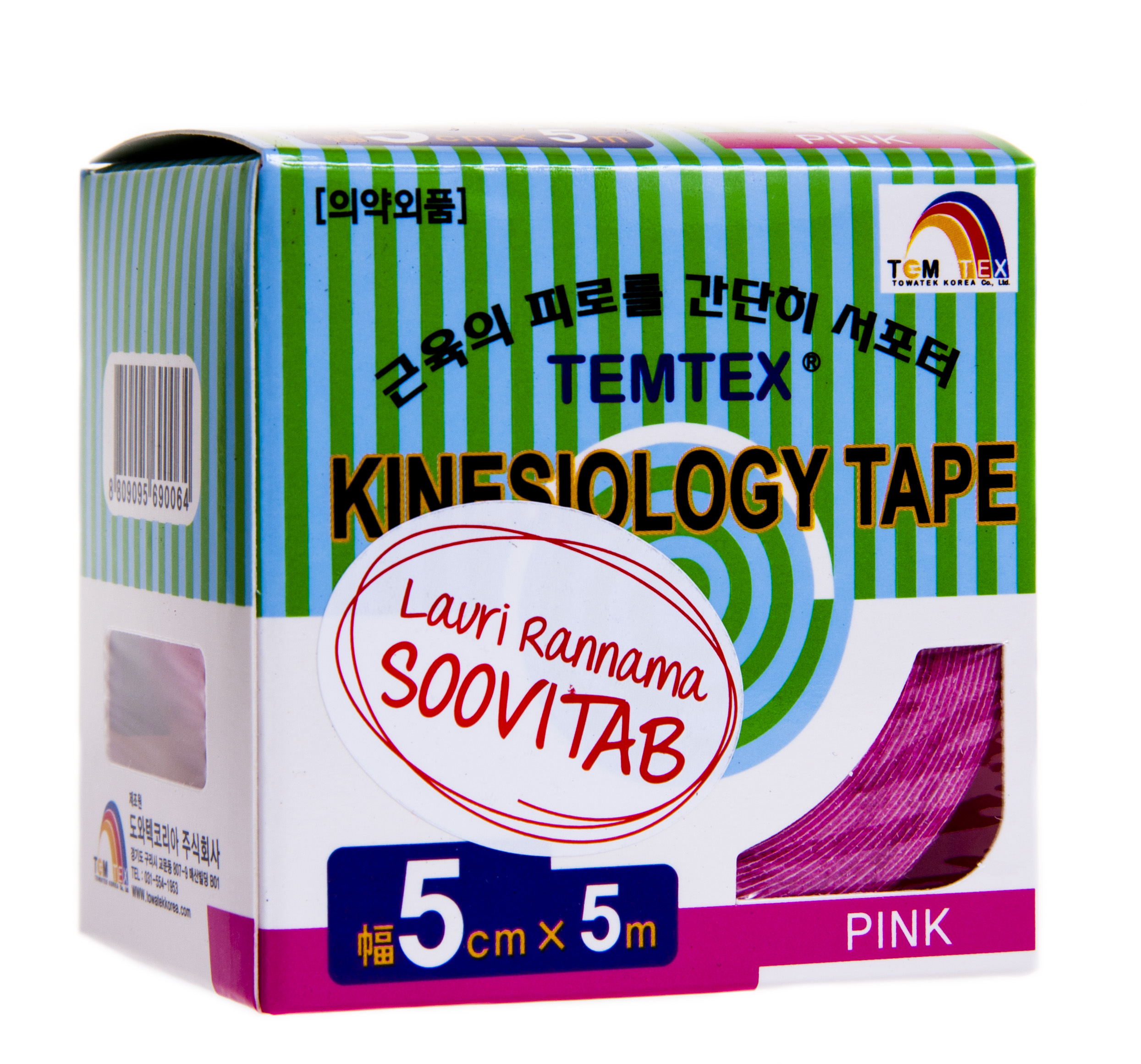 Kinesioteip on kangast ja akrüülliimist veniv teip, mida kasutatakse taastusravis ja spordimeditsiinis. Kinesioteip on väga paljude kasutusvõimalustega: fikseerib ja stabiliseerib, kiirendab keha verevoolutuse, lümfi ja ainevahetuse protsesse, säilitab paigaldamisel keha normaalse dünaamilise liikuvuse. Kasutamine: Mitte hoida nahal üle 5 päeva. Teip tuleb nahalt eemaldada ettevaatlikult. Mõõdud: 5m x 5cm. Värv: roosa. Päritoluriik: Korea. Maaletooja: OÜ Borealis Holding...