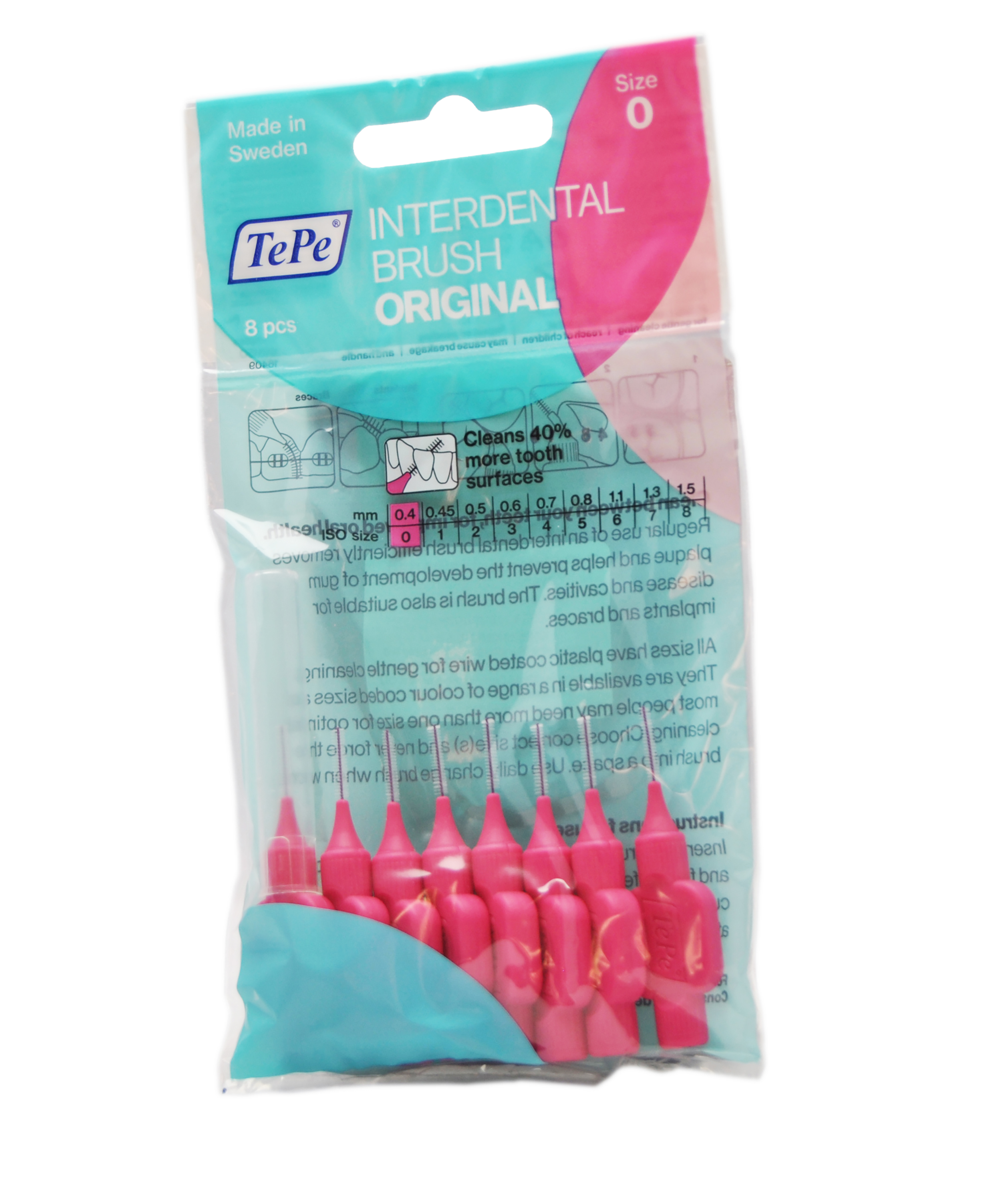 TePe interdentaalharjad. 0. suurus, 0,4mm Hambavahede puhastamiseks. Pakendis on 8tk. + otsik, mis tagab mugava kaasaskandmise. Otsik on ühtlasi ka käepidemeks. Kasutamisjuhised Hambavahede puhastamine on samavõrd oluline kui hambaharja kasutamine. Kasuta igapäevaselt hambavaheharju, soovitavalt õhtuti peale hambapesu. Lükka hari hammaste vahele igemepiiril ja keeruta kergelt vindiga. See hõlbustab juurdepääsu ja pikendab harja kasutusiga. Liiguta harja sujuvalt edasi-ta...