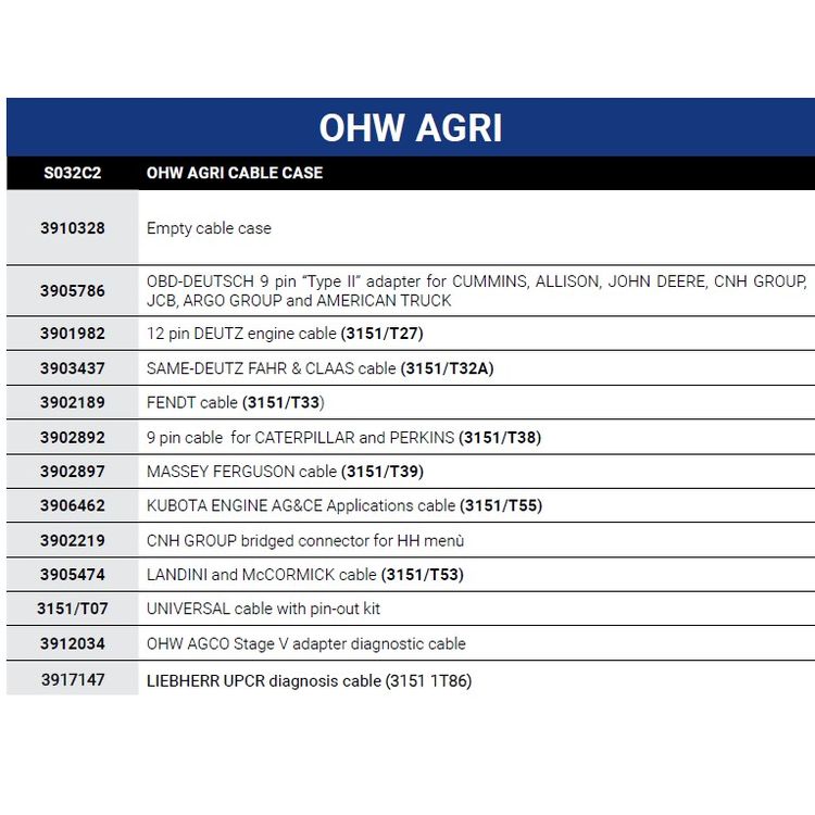 (EN) Diagnostic cables set, testri mudel: MULTIHUB/NAVIGATOR TXTs, diagnostikakeskkond: AGRI Tootekood: TEX S032C2 GTIN: 8056697403688 | 933,39 € | Poodi | ||