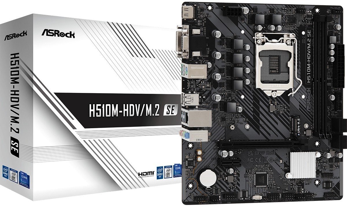 Discover the ASRock H510M-HDV/M.2 SE motherboard, a cornerstone for your PC build that combines performance, connectivity, and audio quality into one compact package. Designed to support both 10th and 11th Generation Intel Core processors, this motherboard ensures compatibility with a wide range of CPUs for versatile system configurations. With its support for DDR4 SDRAM at speeds up to 3200 MHz, it offers the bandwidth and speed necessary for efficient multitasking and smooth operation. The inclusion of High Definition Audio with the Realtek ALC897 Audio Codec provides an immersive sound experience, perfect for gaming, movies, and music. Storage solutions are robust and flexible, featuring both Serial ATA-600 and Ultra M.2 socket interfaces for high-speed data transfers and ample storage capacity. Connectivity is a breeze with a variety of ports including HDMI, VGA, DVI-D, and USB 3.2 Gen 1, ensuring you can connect all your essential peripherals. Whether you're building a new PC or upgrading an existing one, the ASRock H510M-HDV/M.2 SE motherboard offers a solid foundation with its blend of performance, connectivity, and quality.