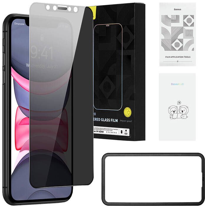 Baseus tempered glass with 0.3mm privacy filter for iPhone 11/XRYour phone will be safe with Baseus glass. The tempered glass features high impact and scratch resistance, and its high transparency ensures original image quality. This thin cover, thanks to special technology, provides privacy protection, and the additional oleophobic coating will not only take care of flawless touch operation, but also help keep the screen clean. The Baseus glass is designed specifically for the iPhone 11/XR, making it a perfect fit anywhere on the screen. It also provides dust protection for the speaker without affecting its operation, and because it is ultra-thin and transparent it does not interfere with the facial recognition system. You can easily install the glass yourself. Ensure complete freedomThe tempered glass from Baseus has a high-tech coating that protects your privacy from every angle. What does this mean? The protection consists of a double coating that blocks light reflections, so that the screen image is visible only when you look at it from the front. With Baseus glass, you can feel safe and comfortable using your phone in public spaces. What's more, the product is extremely thin, so, it feels as if it is not there at all, so it does not interfere with the use of the case. ManufacturerBaseusNameTempered glass with 0.3mm privacy filter Baseus for iPhone 11/XRMaterial Crystal tempered glassThickness0.3mmCompatibilityiPhone 11/XR