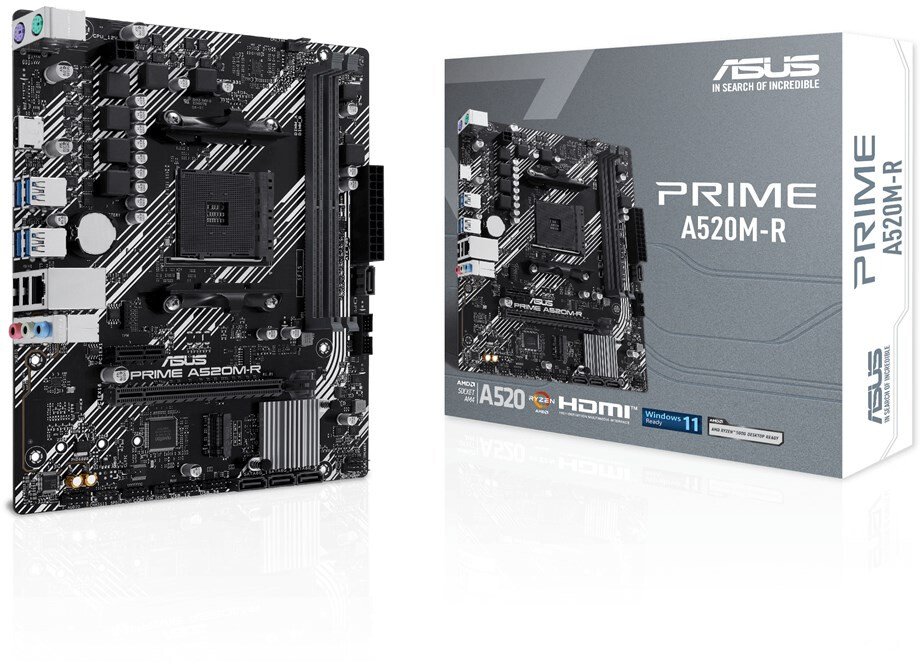 The ASUS PRIME A520M-R motherboard provides a reliable foundation for building high-performance PCs, suitable for gamers, creators, and professionals. It supports a broad spectrum of Ryzen processors, from the 3000 Series to the 5000 G-Series, offering users the flexibility to select the ideal CPU for their requirements. With high definition 8-channel audio, it offers an exceptional sound experience, enhancing games, movies, and music. The motherboard's support for DDR4 memory up to 5100 MHz (O.C.) ensures smooth and responsive performance, perfect for multitasking and demanding applications. Connectivity is straightforward, with a variety of ports including USB 3.2 Gen 1 and HDMI, making it easy to connect to a wide range of devices. Constructed with ASUS 5X Protection III, including overvoltage protection and a stainless steel back I/O, the PRIME A520M-R is built for durability and long-term reliability, representing a wise choice for anyone looking to build a powerful, future-proof PC.