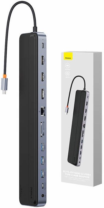 Hub 12in1 Baseus EliteJoy Gen2 series USB-C to 2xHDMI+ 3xUSB 3.0+ PD+ DP+ SD/TF+ RJ45+Type-C+ 3.5mm (dark gray)You can easily increase the capabilities of your MacBook with the Baseus brand Hub. The product offers up to 12 additional ports, supports fast charging protocols and enables high-speed data transmission. It stands out for its solid and well-thought-out design, thanks to which it will also serve you as a laptop stand.Fast USB-C port expansionThe hub's impressive interface solves the problem of lack of space for connecting additional devices to your laptop. The product offers a USB-C port designed for 100 W fast PD charging, 4K HD2, 4K HD1 and DP ports with which you can connect up to 3 additional displays to your laptop. At your disposal are also inputs for TF/SD cards, 3 x USB 3.0, USB-C, so you can easily and quickly transfer data from cards or flash drives to your laptop. There is no lack of a 3.5mm audio headphone port and an RJ45 input for a network cable.Practical stand functionThoughtful design makes it an extremely practical device. It will serve you not only as a hub, but also as a laptop stand with an 8° tilt - such an angle will improve your comfort and allow you to rest your wrists. Moreover, such a solution allows you to keep your desk in order and save a lot of space.Solid constructionThe product was made of high-quality materials and has a silicone, non-slip finish, thanks to which it provides solid support for your laptop. It works with Windows, iOS, Windows Vista and Linux and provides wide compatibility. In addition, it is equipped with a number of safety features that counteract voltage, short circuit, etc.ManufacturerBaseusNumberWKSX030213ColorDark grayMaterialAluminum alloy + siliconeWeight~267 gUSB 3.0 x 3500 MB/sUSB-C data500 MB/sUSB-C PDMax 100 WDP4K 60Hz max4K HD14K 60Hz max4K HD24K 30Hz mxSD/TF104 MB/sRJ451000 Mbps max3.5 audioSupports headphones and speakersPD input5V/3A, 9V/3A, 15V/3A 20V/5AUSB output5V/0.9ASupported systemsWindows, Apple iOS, Linux, VistaCompatibilityPopular notebooks, phones, MacBooks with USB-C input