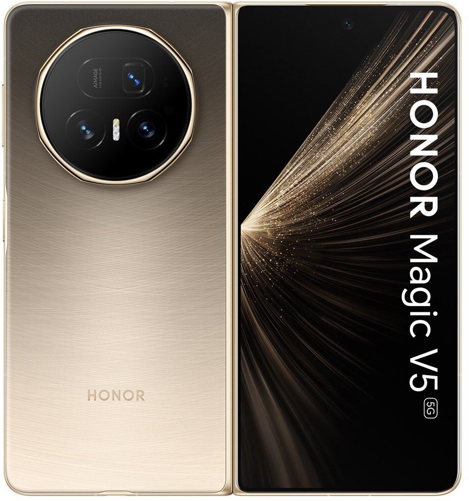 Model Magic V5 | Built-in storage 512 GB | RAM 16GB | Gold | OS Android 15.0 | Screen 7.95" | LTPO AMOLED | CPU Octa-core (2x4.32 GHz Oryon V2 Phoenix L + 6x3.53 GHz Oryon V2 Phoenix M) GPU Adreno 830 | Dual SIM | Camera 50MP+64MP+50MP | Front-facing Camera 20MP | Bluetooth/USB/NFC/Wi-Fi/Wi-Fi Direct | Bluetooth | Bluetooth 6 | GPS / geotagging | Charging power (max) 66 Watts | Wireless charging | Battery capacity 5820 mAh | Dimensions Unfolded: 156.8 x 145.9 x 4.1 mm or 4.2 mm Folded: 156.8 x 74.3 x 8.8 mm or 9.0 mm | Weight 0.217 kg