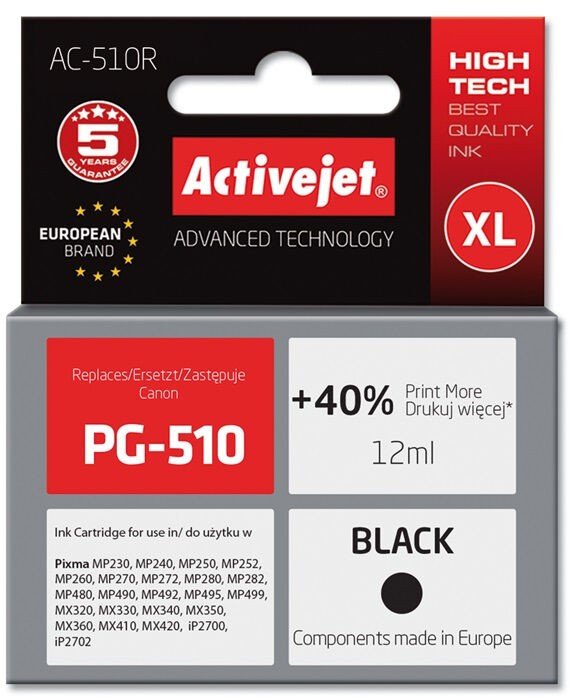 Activejet AC-510R Ink cartridge (replacement for Canon PG-510; Premium; 12 ml; black) Tootekood: AC-510R GTIN: 5901452136215 Inkprinter accessories and supplies | 19,60 € −0,05 € | Poodi | ||