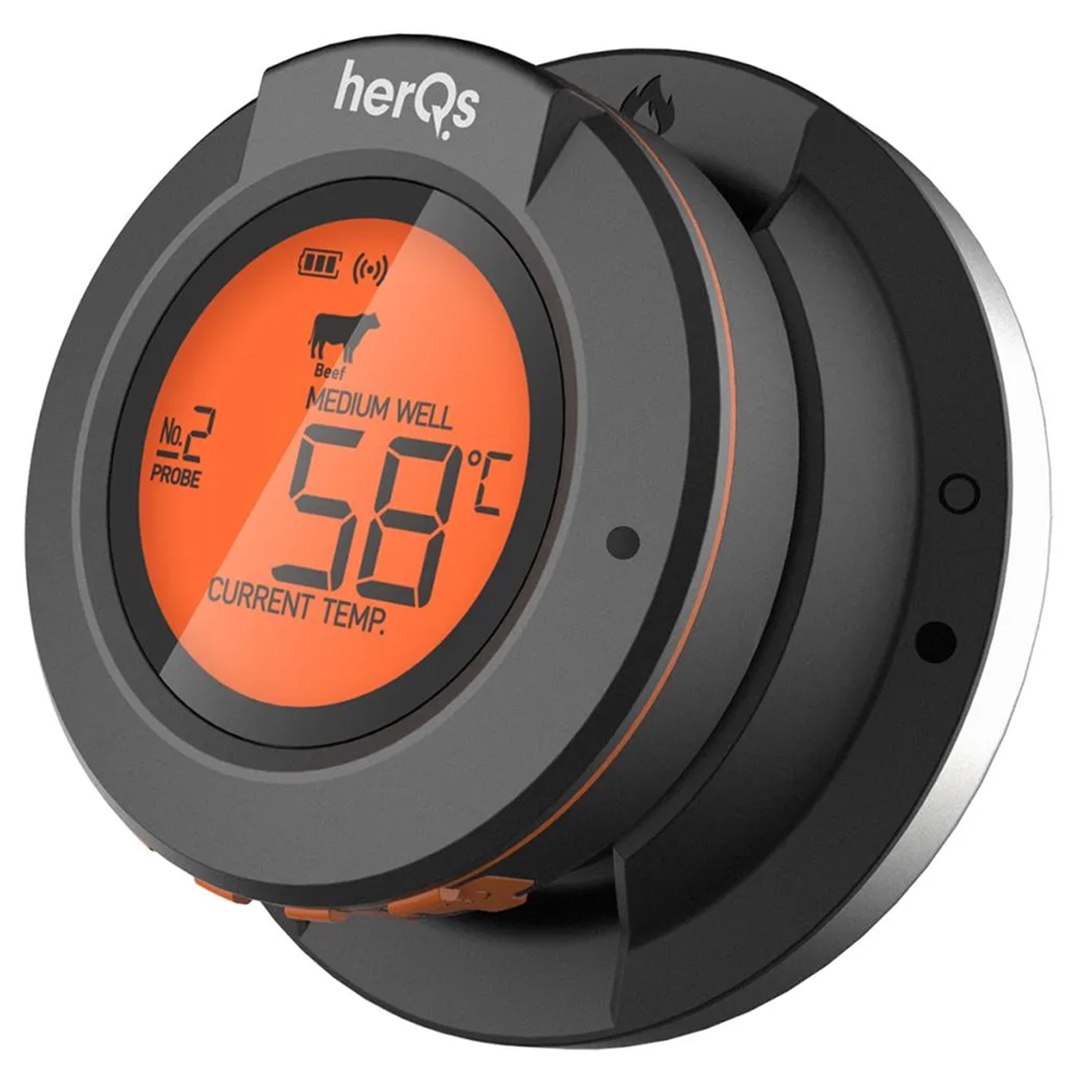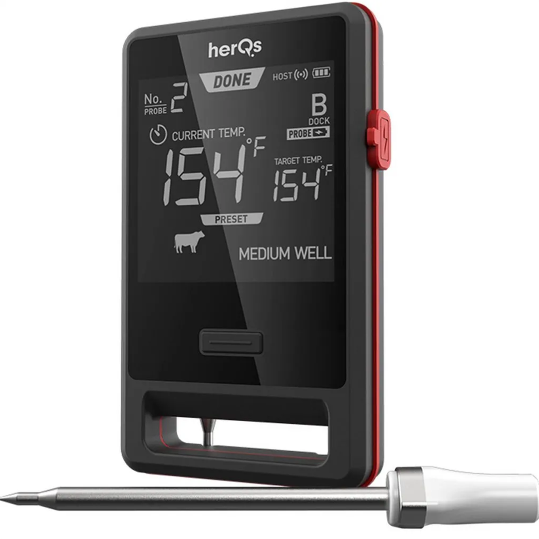 HerQs Dome termomeeter – hädavajalik tööriist, mis tõstab sinu grillimise kogemuse uuele tasemele ja tagab iga kord täiuslikult valmistatud toidud. Tänu nutikale ühenduvusele ja pika leviala Bluetooth-tehnoloogiale muudab see termomeeter grillimise lihtsaks, võimaldades igal inimesel kokata nagu professionaal. • Nutikas ühenduvus tasuta herQs rakendusega • Kuuetunnine sondide jälgimine • Pika levialaga Bluetooth-ühendus kuni 60 m • Aku kestus kuni 200 tundi • Täpsed temperatuurivahemikud kuni 300℃ • Vastupidav disain IP65, FDA ja LFGB sertifikaatidega