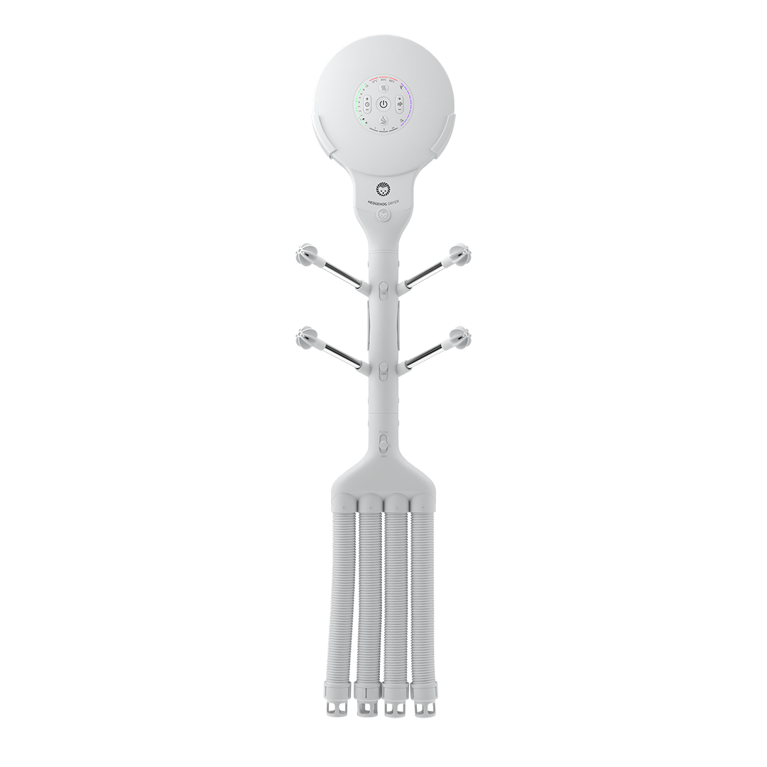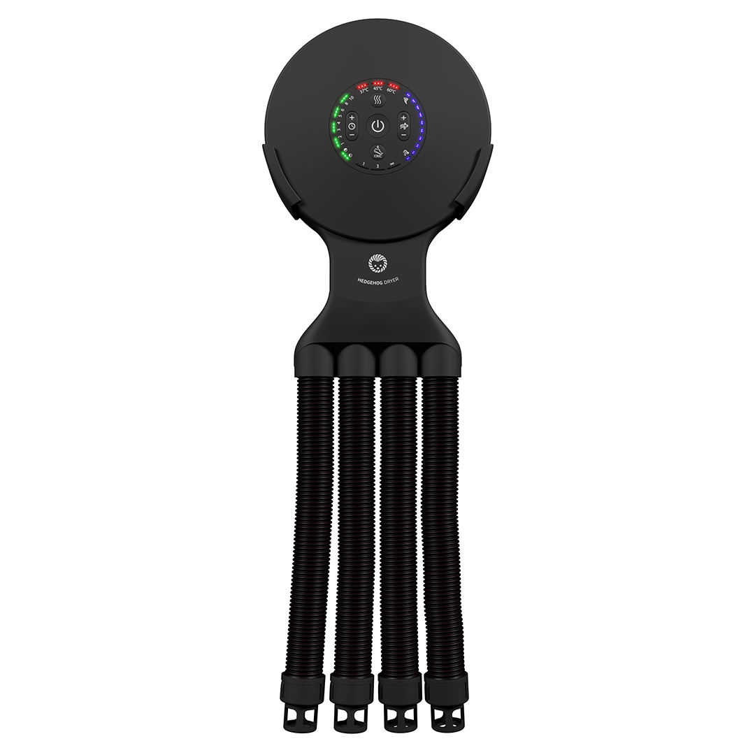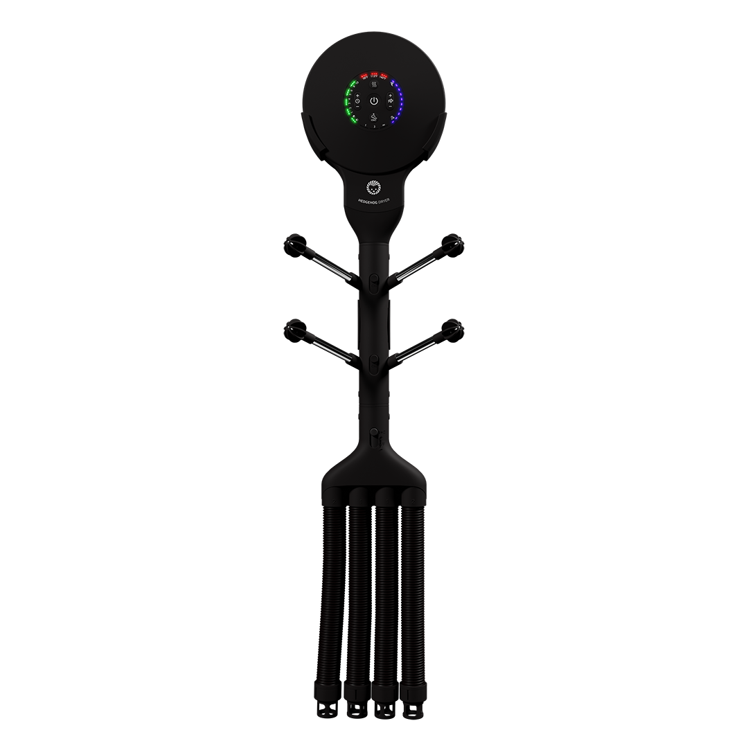 Revolutsiooniline kõik-ühes kuivati tagab ülikiire saabaste, jalanõude ja kinnaste kuivatamise. Sisseehitatud ioonpuhasti eemaldab lõhnad ja bakterid. Hedgehog Buddy ainulaadsel disainil on 2 voolikut raskete saabaste kuivatamiseks ja 4 piiki (2 paari) jalanõude ja kinnaste kuivatamiseks. Õhuvoolu saab igale paarile eraldi sisse ja välja lülitada, et tagada maksimaalne tõhusus. • Õhuvool: 105 m³/h • Mootori kiirus: 4500 p/min • Rõhk: 300 Pa • Pinge: 110 / 220–240 V