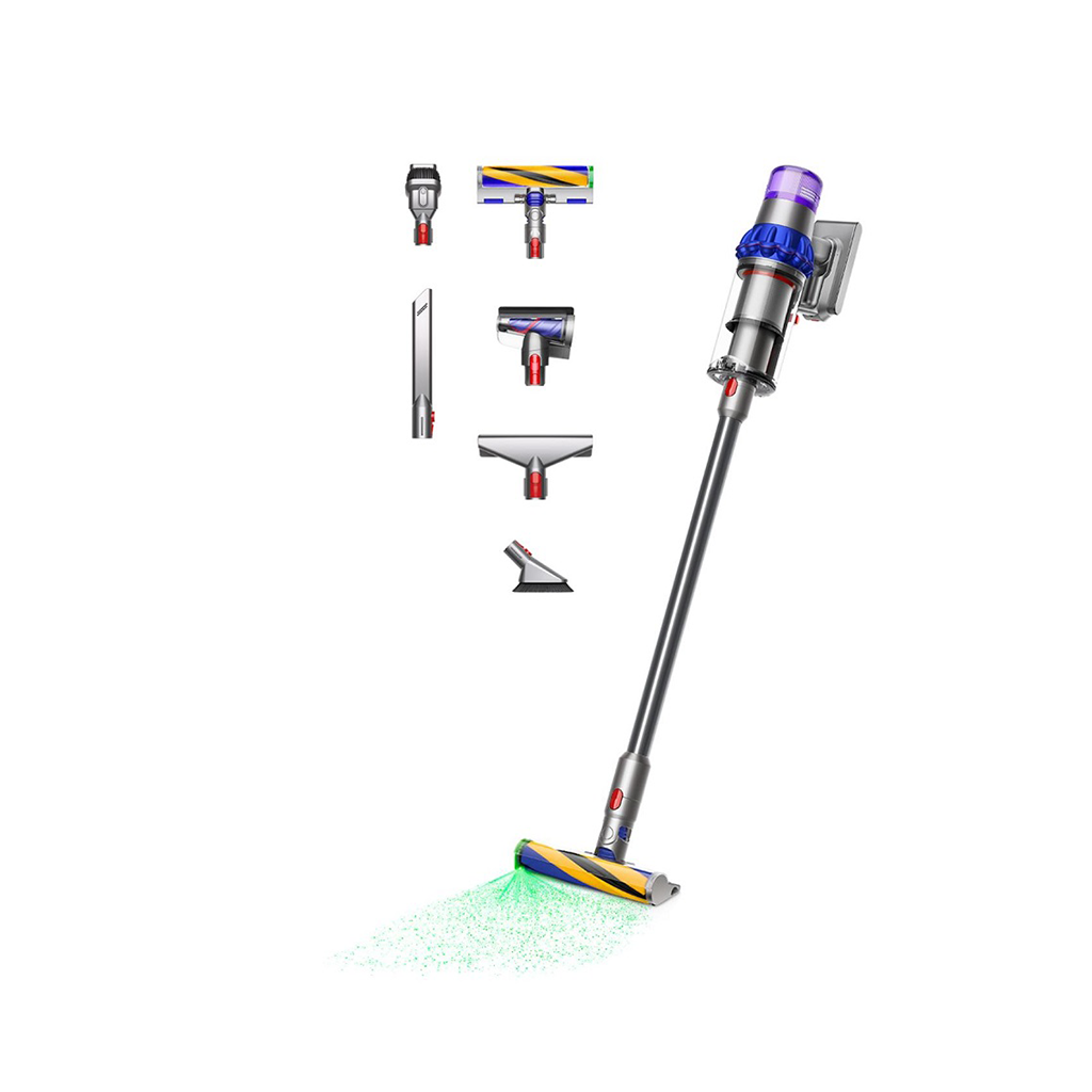Dyson reveals microscopic dust Dyson´s illuminating technology reveals hidden dust on hard floors - so nothing is missed. Deep cleans carpets automatically In auto mode, the Dyson DLS™ technology inside the digital motorized nozzle monitors the resistance of the brush part 360 times per second and intelligently adapts the power to different floor types. (5) Measure microscopic dust particles The piezo sensor continuously counts dust particles and sorts them according to size – automatically increasing the suction power if necessary. (2) Scientific proof of deep cleansing The LCD display shows what has been vacuumed and shows real-time scientific proof of deep cleaning. (2) Click-in battery Detach and replace the battery at the push of a button and get uninterrupted power for up to 60 minutes to clean here, there and everywhere in your home (another battery can be purchased separately). (3) Multi-stage filtering Dyson´s fully enclosed filtration captures 99.99% of microscopic particles and allergens as small as 0.3 microns – releasing cleaner air. (4) Hair screw die. Picks up long hair and pet hair. Quickly. The tangle-free, conical brush part twists the hair away from the nozzle, directly into the waste container. Motorized cleaning for small spaces. Three power modes Auto mode intelligently adapts with an optimal balance between power and operating time. Eco mode offers longer usage time for larger cleanings, while Boost mode is designed for short, intensive cleaning. Technical information: Weight 2.7 kg Dimensions (H x W x L) 1205 x 266 x 250 mm Dust container volume 0.76 l Rated power 660 W Suction power 240 AW Battery life up to 60 minutes Battery type Li-ion Charging time approx. 4.5 h Filtration: Dyson´s fully enclosed system captures dust and traps 99.99% of microscopic particles that can be as small as 0.3 microns