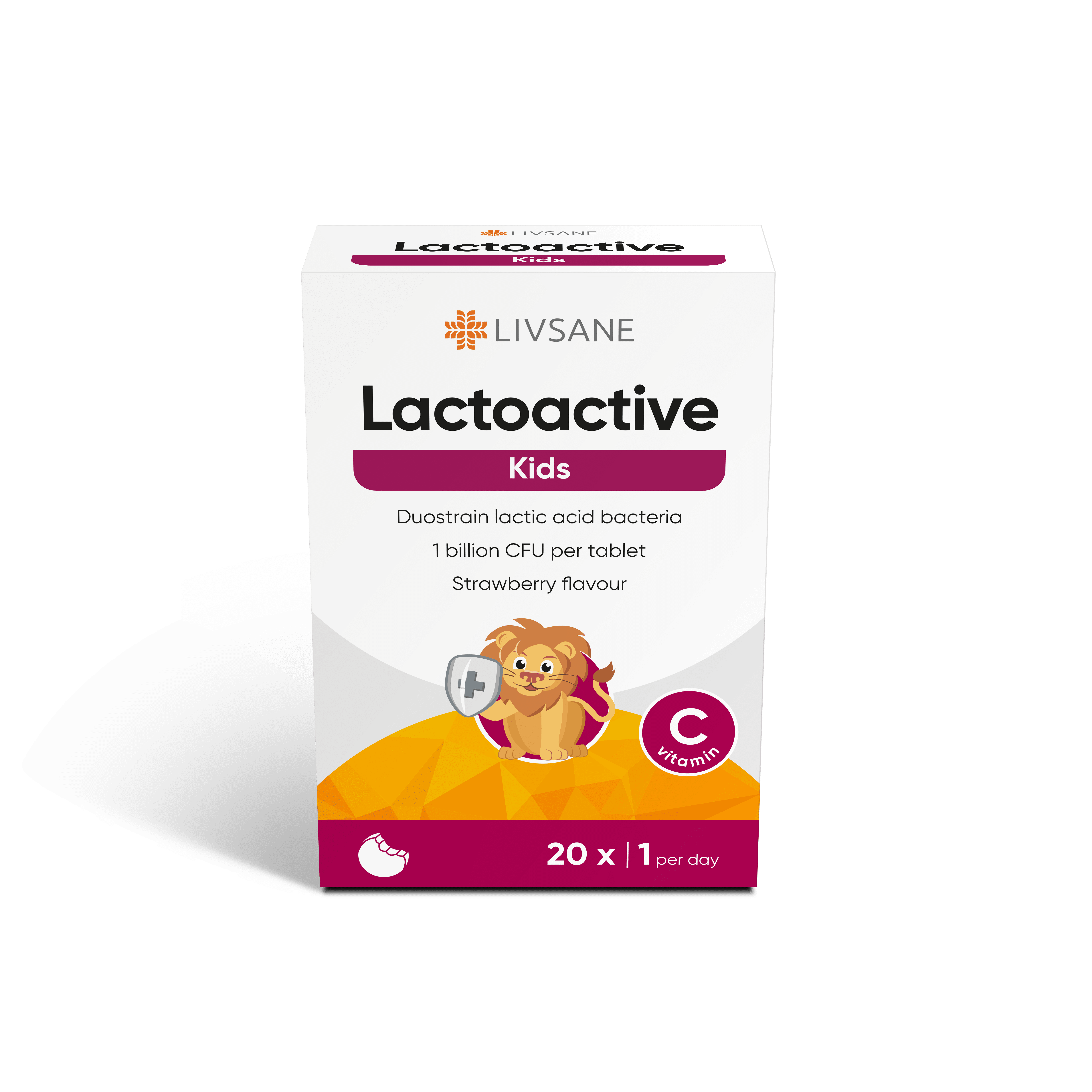 LIVSANE Lactoactive Kids maasikamaitselised närimistabletid lastele sisaldavad 5 miljardit elus piimhappebakterit ja C-vitamiini. Toidulisandi piimhappebakterid jõuavad soolestikku elusatena ja aitavad toetada soolestiku mikrofloorat. Vitamiin C aitab kaasa immuunsüsteemi normaalsele talitlusele, aitab vähendada väsimust ja kurnatust ning suurendab raua imendumist. Hoiatused: Oluline on toituda mitmekülgselt ja tasakaalustatult ning harrastada tervislikku elustiili! Mitte ületada päevaseks tarbimiseks soovitatavat kogust! Toidulisandit mitte kasutada mitmekesise toitumise asendajana! Hoida toodet lastele kättesaamatus kohas!Liigne kasutamine võib põhjustada kõhulahtisust!