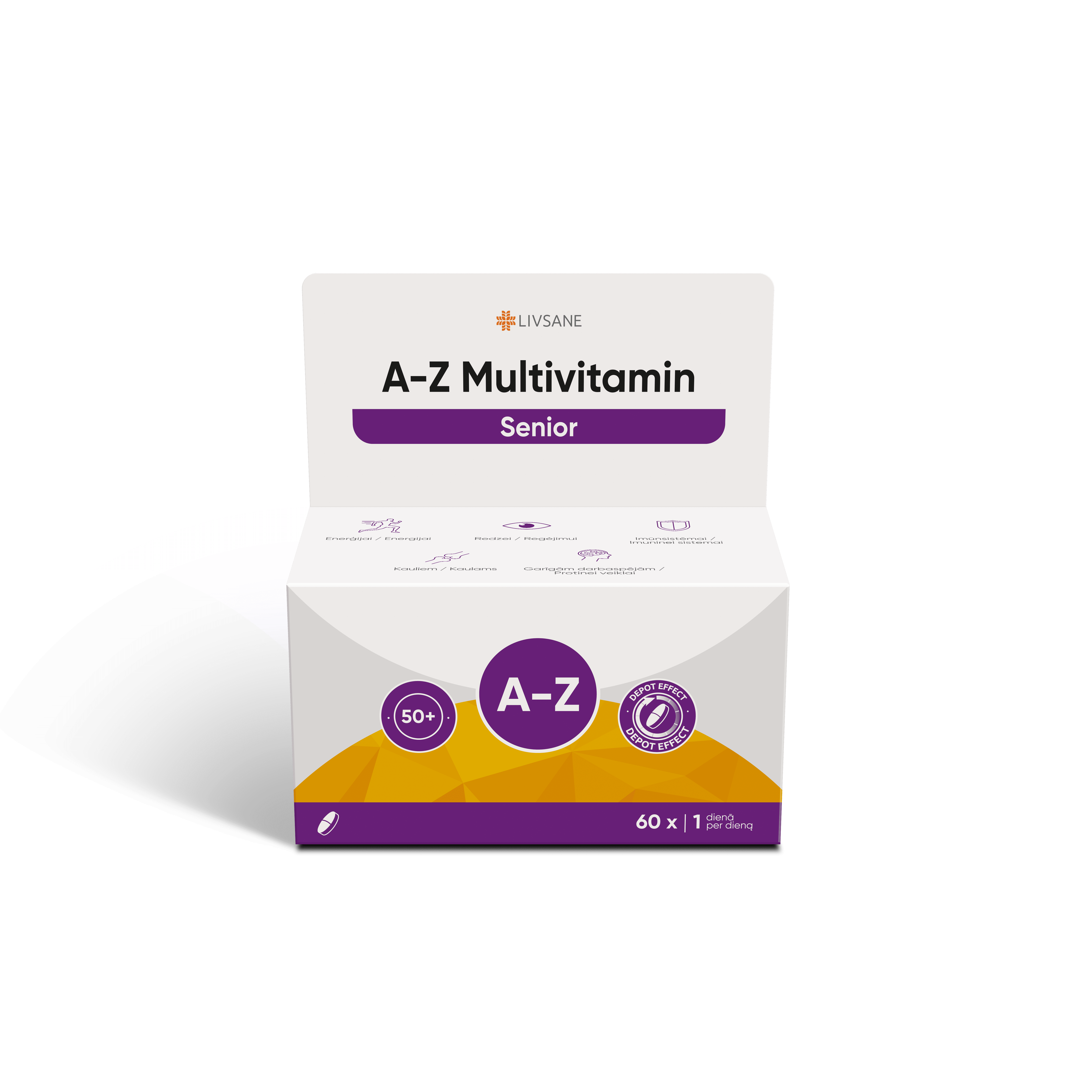 LIVSANE A-Z Multivitamin Depot sisaldab A-vitamiinist tsingini kõiki olulisi vitamiine, mineraalaineid ja mikroelemente hästi tasakaalustatud suhtega, mis on kasulik igapäevase toidusedeli täiendamiseks. Vitamiin C, tsink ja seleen aitavad kaasa immuunsüsteemi normaalsele talitlusele. Tsink ja raud aitavad kaasa normaalsele kognitiivsele funktsioonile. A-vitamiin ja tsink aitavad kaasa normaalsele nägemisele. E-vitamiin, tsink ja vask aitavad kaitsta rakke oksüdatiivse stressi eest. B1-, B2-, B6- ja B12-vitamiin, vask ja mangaan aitavad kaasa normaalsele energia omastamise ainevahetusele. Aeglase vabanemise efekt tagab, et vitamiinid, mineraalained ja mikroelemendid vabanevad edasilükkunud viisil ning on seetõttu kehale kättesaadavad pikema aja jooksul. Juba üks tablett päevas annab olulise panuse 25 vajaliku toitaine varustamiseks organismis. Ühes pakendis on 60 Depot tabletti, mis jätkub umbes 2 kuuks.