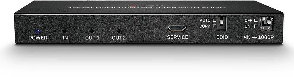 Displays HDMI signals across 4 displays simultaneously from one source deviceSupports resolutions up to 4K 60Hz 4:4:4, with additional support for HDRExtract digital and analogue audio from HDMI for non-HDMI amplifiersFeatures a neat switch for downscaling from 4K to 1080p2 year warranty The Lindy 4 Port HDMI 2.0 18G Splitter with Audio is a multi-function solution for distributing high quality HDMI signals across 4 displays simultaneously from one source device, while extracting digital or analogue audio separately.With support for resolutions up to 4K 60Hz 4:4:4 8bit, this splitter is great for creating eye-catching quad display digital signage in retail scenarios, displaying sports across multiple screens in sports bars or distributing engaging multiscreen educational presentations at tradeshows. The splitter also has separate optical and 3.5mm audio ports to easily extract audio from HDMI to connect non-HDMI amplifiers or soundbars, ideal for supporting video with immersive multichannel audio.The splitters also feature an integrated switch to downscale the input signal to Full HD, making installations with older displays hassle free while always ensuring the viewer receives the optimum picture from their display.