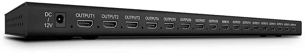 Distributes content from a single HDMI source across 16 HDMI displaysSupports resolutions up to 4K@60Hz, with additional support for HDRHDCP 2.2 for enhanced compatibility with 4K contentSmart EDID Management control to ensure the optimum video performance2 year warranty HDMI splitters are high quality solutions for distributing identical content simultaneously across several HDMI displays. The Lindy 16 Port HDMI Splitter is a professional solution for distributing high quality HDMI content simulateneously across 16 seperate displays, when connected to a single HDMI source such as media players, PCs or set top boxes. With support for full 4K@60Hz resolutions and HDR, content can be viewed in superior quality with a wider colour gamut and greater contrast. The splitter is perfect for creating eye-catching digital signage in retail, hospitality, conference rooms, transport hubs or impressive residential installations. HDCP 2.2 support also ensures seamless playback of 4K and Full HD content including video games, Blu-rays and on-demand video. The splitter also includes a smart EDID dip switch for ensuring the optimum resolutions possible are shown on the connected displays.