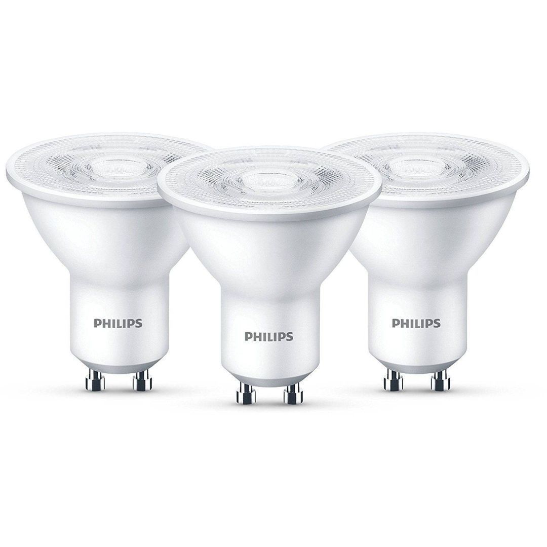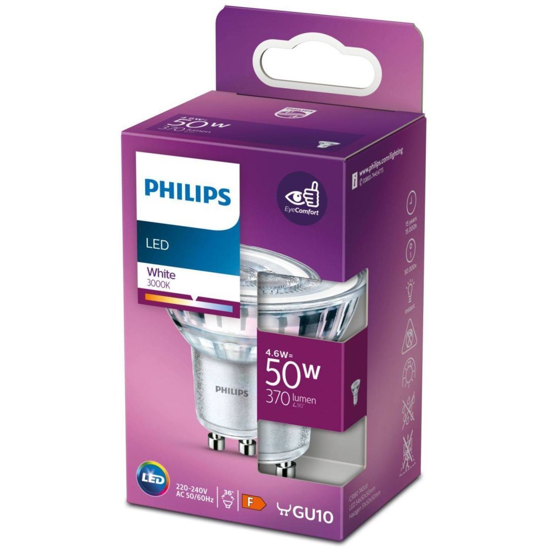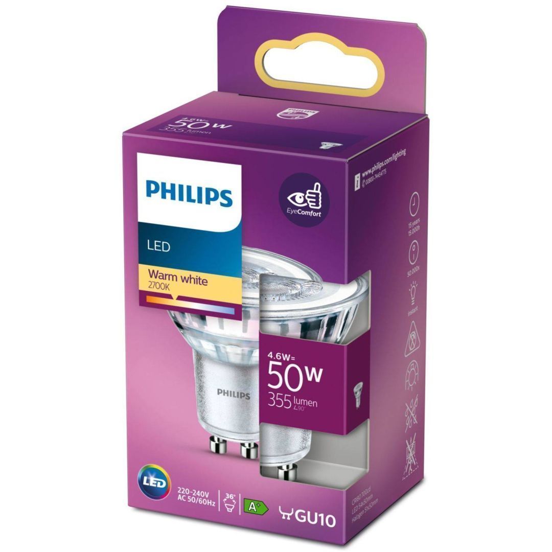 Philips LED lamp on võimsusega 4,7 W, mis on samaväärne 50 W hõõglambiga. Valgusti sokkel on GU10 ja värviesitusindeks >80 Ra. Lambi eluiga on 15000 tundi, valgustemperatuur 2700 K ja valgusvoog 380 lm. Energiaklass on E. Pakendis 3 tk.