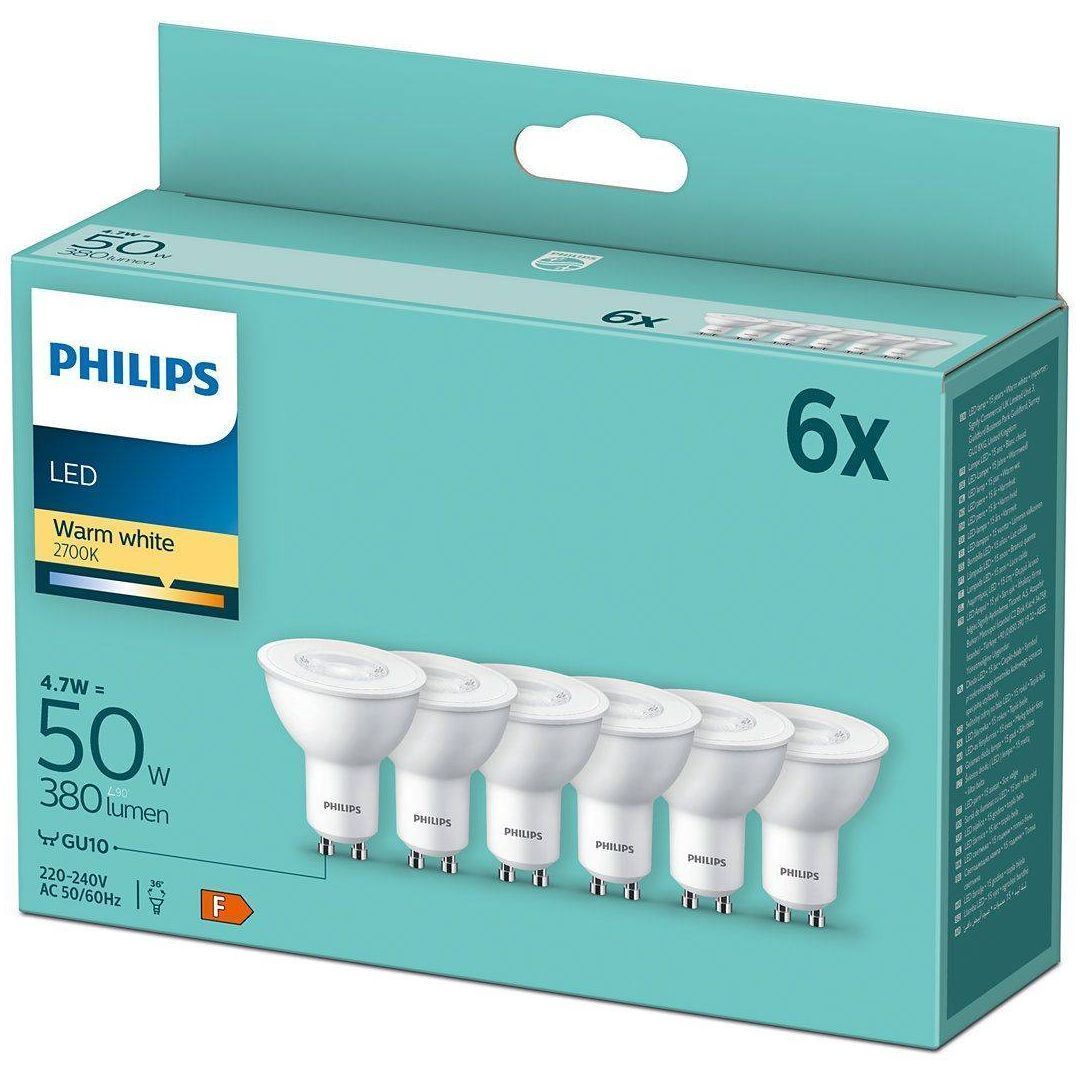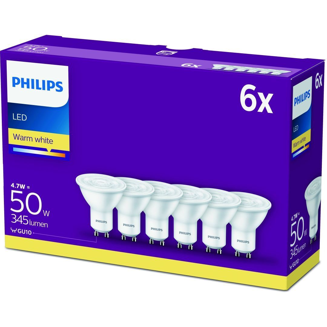 Philips LED lamp on võimsusega 4,7 W, mis on samaväärne 50 W hõõglambiga. Valgusti sokkel on GU10 ja värviesitusindeks >80 Ra. Lambi eluiga on 15000 tundi, valgustemperatuur 2700 K ja valgusvoog 380 lm. Energiaklass on E. Pakendis 6 tk.