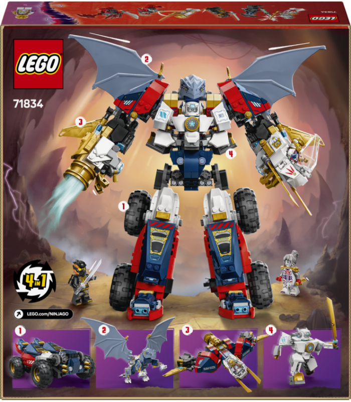 | Alfashop | LEGO Ninjago Zane’i Ultra robotikomplekt GTIN: 5702017815695 LEGO, arendavad mänguasjad <p>• Neli ühes robotimänguasi lastele – 9-aastased ja vanemad poisid ja tüdrukud saavad taasluua tegevusi sarja NINJAGO® Dragons Rising 3. hooajast selle Zane’i Ultra robotikomplektiga<br />• Muudetava asendiga NINJAGO® mänguasi – suurel robotil on muudetava asendiga jalad, käed, randmed, sõrmed ja pea, lisaks draakonitiivad, kokpit, 2 laskurit ja suur mõõgatarvik<br />• Eemaldatavad ninjamudelid – Zane'i Ultraroboti saab jagada 4 väiksemaks mudeliks: reaktiivlennukiks, automänguasjaks, tegevusfiguuriks ja draakoniks<br />• 6 LEGO® NINJAGO® minifiguuri – selles seiklusmängukomplektis on ninjad Sora ja Cole ning nende liitlane Pixal, kes astuvad vastu kurikuulsale kolmikule: Nokt, draakonisõdalane ja draakoniskaut<br />• Sünnipäevakingitus lastele – see seiklusmänguasi pakub lõbusat ehitamis- ja mängukogemust ning on kingiidee lastele, kellele meeldib mängida ninjakangelastega<br />• Suuremad ninjaseiklused – vaata ka teisi NINJAGO® mänguasju (müüakse eraldi), kus on templid, robotid ja sõidukid<br />• Ninjamänguasjade universum – LEGO® NINJAGO® komplektid võimaldavad lastel koos ninjakangelastega põgeneda seiklusrikkasse fantaasiamaailma<br />• Mõõdud – selle lastele mõeldud 1187-osalise LEGO® ehituskomplekti robot on 35 cm kõrge, kui tiivad on üles tõstetud</p> | 3-6 tp | 82,81 € | Poodi | |