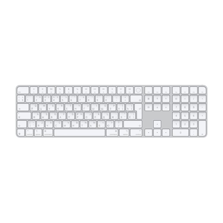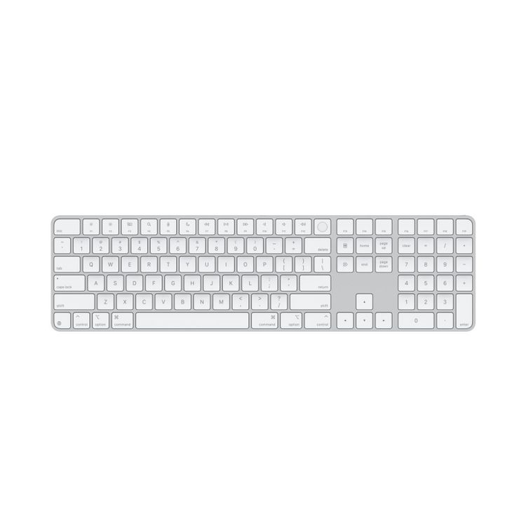 Magic Keyboard with Touch ID and Numeric Keypad for Mac models with an Apple chip - English (International) - White KeysThe Magic Keyboard is available with Touch ID, which quickly and securely authenticates you when logging in and making purchases.The Magic Keyboard with Touch ID and Numeric Keypad offers exceptional comfort and precision when typing. It features an expanded keyset, including keys designed for fast scrolling through documents, as well as full-size arrow keys that gamers will appreciate. The Numeric Keypad is especially useful for working with spreadsheets and financial applications. The keyboard is wireless and has a built-in rechargeable battery that lasts a full month or more on a single charge. It automatically pairs with your Mac, so you can get to work right away.It comes with a USB-C port and a woven USB-C charging cable that allows you to pair and charge the accessory by connecting it to your Mac's USB-C port.System requirements: Mac with an Apple chip and macOS 15.1 or later.
