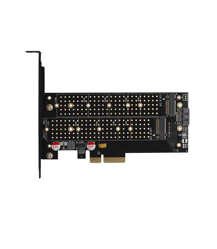 <p>PCEM2-D PCIe NVMe+SATA M.2 adapter</p> <p>A PCI-Express x4 adapter to connect up to two M.2 disks to a computer. 1x NVMe M-key + 1x SATA B-key.</p> <p>The internal AXAGON PCEM2-D adapter allows to connect as many as two M.2 SSD to a desktop. So, it is an ideal choice for upgrading a desktop computer that has no M.2 slot.</p> <p>The adapter supports the use of both one-sided and double-sided SATA and NVMe (PCI-Express) M.2 SSDs. The reduction does not limit SSD capacity, and any M.2 cards with a length up to 110 mm can be used. The simultaneous operation of both disks is commonplace.</p> <p>Thanks to PCI-Express interface compatible with x4, x8 and x16 slots, a maximum transmission rates can be achieved. When compared to standard SATA SSDs, bit rates of NVMe SSDs are many times higher.</p> <p>The high quality card design, including copper-plated vents, assists in a better dissipation of heat generated during the M.2 SSDs operation.</p> <p>Double LEDs indicate either power on or data transfer in the M.2 slot.</p> <p>The package also contains a low profile bracket for mounting the adapter into low profile cases.<br /> Included Accessories • PCI-Express adapter with a standard bracket,• low profile bracket,• 2 pcs. thermally conductive pads,• SATA data cable 50 cm long,• mounting material and a screwdriver</p>
