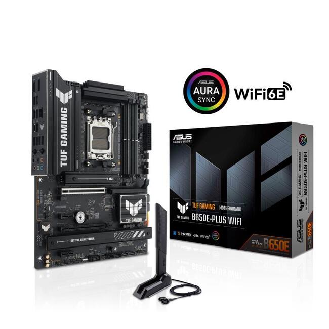 <p><strong>TUF GAMING B650E-PLUS WIFI</strong><br /> <br /> ASUS TUF GAMING B650E-PLUS WIFI takes all the essential elements of the latest AM5 Socket for AMD Ryzen™ Desktop Processors and combines them with game-ready features and proven durability. Engineered with military-grade components, an upgraded power solution and a comprehensive cooling system, this motherboard goes beyond expectations with rock-solid and stable performance for marathon gaming. TUF GAMING motherboards also undergo rigorous endurance testing to ensure that they can handle conditions where others may fail. Aesthetically, this model incorporates rugged off-black and geometric design elements to reflect the dependability and stability that defines the TUF GAMING series. This platform delivers the power and connectivity that advanced AI PC applications demand.</p>