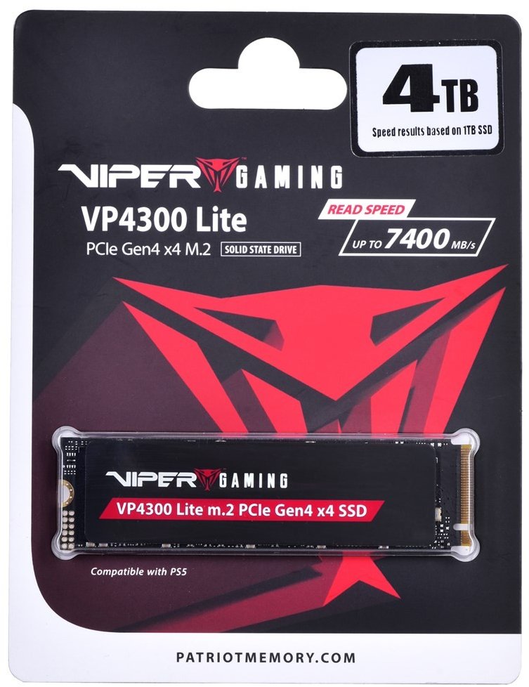 Viper VP4300 Lite The VP4300 Lite with the latest PCIe Gen4 x4 controller is fully NVMe 2.0 compliant and fully compatible with both PC and Playstation 5. It has sequential read speeds of up to 7400 MB/s, sequential write speeds of up to 6000 MB/s and PS5 sequential read speeds of 6100 MB/s and 2000 TBW. The VP4300 Lite will blow away rivals every time. The VP4300 Lite is built with world-class materials and features a high-performance, slim graphene heat shield. It therefore offers the perfect combination of performance and security and reliability ideal for any gamer.