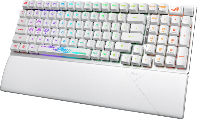 | Arvutitark OÜ | ASUS ROG Azoth Customizable Gaming Keyboard 75% White, DE Tootekood: 90MP031A-BKDA11 GTIN: 4711387209431 Keyboards ROG Azoth ROG Azoth gaming custom keyboard with 75 keyboard form factor, gasket mount, three-layer dampening foam and metal top cover, highly customizable with hot-swappable pre-lubed ROG NX mechanical switches, ROG keyboard stabilizers, PBT doubleshot keycaps and lube kit, tri-mode connection with 2.4 GHz SpeedNova technology, OLED display, three-way control knob, three tilt angles, and Mac support Unique gasket mount design: Silicone gasket mount with three layers of dampening foams combine to provide an unrivaled typing experience Tri-mode connection: Use Bluetooth® to connect and switch between three devices at a time, ROG SpeedNova wireless technology provides up to 2,000+ hours of low-latency gameplay in 2.4 GHz RF wireless mode (OLED & RGB off), or use standard wired USB OLED display and intuitive controls: View system info and keyboard settings at a glance; built-in three-way knob allows for quick settings adjustment Hot-swappable ROG NX mechanical switches: Pre-lubed switches for smoother clicks and eliminates bouncing noises respectively; fast actuation and ROG-tuned force curves provide great keystroke feel and consistency Enhanced typing experience: Pre-lubed keyboard stabilizer produces less friction for smoother keystrokes and stability for longer keys; durable ROG PBT doubleshot keycaps offer a premium feel Switch lube kit: Bundled essentials including Krytox™ GPL-205-GD0 lubricant to get beginners started on keyboard DIY Ergonomic design: Two pairs of keyboard feet of different heights provide up to three tilt positions MacOS support: Easily toggle between Windows and MacOS modes | 275,60 € | Poodi | ||