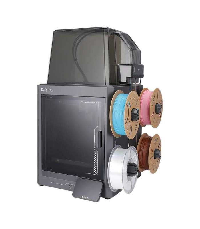 | Arvutitark OÜ | ELEGOO Centauri Carbon 2 Combo 3D printer Tootekood: 50.201.023300 GTIN: 6932704919965 3D Printing materials ELEGOO Centauri Carbon 2 Combo 3D Printer The ELEGOO Centauri Carbon 2 Combo is a modern 3D printer designed for home creators, families, and users who want to print quickly, conveniently, and without technical barriers, without sacrificing advanced capabilities. The CANVAS system for 4-color printing allows you to create multi-color models, while the CoreXY design, automatic calibration, and 31 smart sensors ensure stability and safety. A closed chamber with intelligent temperature management, a nozzle with a maximum temperature of 350°C, and wide material compatibility open the way for both creative projects and more technical utility prints. What's more, its quiet operation (≤ 45 dB) means that the printer will fit perfectly into your home, office, or shared space, working in the background while you focus on your creative work.Smooth color changes during printingThe CANVAS system allows you to instantly change the color of the filament during a single print – without interrupting the process and without user intervention. The use of independent motor control and shortened filament feed paths ensures that color switching is fast, precise, and with minimal delay. In practice, this translates into cleaner color transitions, less material waste, and more predictable results. For the user, this means the ability to create multicolored models—from figurines and decorations to lettering and details—in a single process without having to manually stop printing and change filaments.A printer that responds to problems on its ownRFID filament detection automatically recognizes compatible ELEGOO materials, selecting the recommended print settings for a specific type and color – no need to manually adjust the parameters. The Auto Refill function allows you to continue printing after one spool has been used up, automatically switching to the next roll of the same filament, which is particularly important for large projects that take many hours. In addition, the filament tangling prevention system detects incorrect material feeding, stops printing at the right moment, and minimizes waste through controlled filament retraction. As a result, you can enjoy greater peace of mind, fewer failed prints, and real savings in both time and material—even when the printer is running unattended.Multi-material supportThe Centauri Carbon 2 Combo is designed to work with a variety of filaments, from basic to more technically advanced. A nozzle with a maximum temperature of 350°C and a closed working chamber with intelligent temperature management ensure stable printing conditions, which are essential for materials such as PC or PET. This allows you to freely combine different properties in a single project—rigid structural elements, flexible details, and aesthetic surfaces—without worrying about cracking or layers peeling off. This gives you greater design freedom and the ability to produce both simple home prints and more demanding, functional utility items using a single, universal printer.Stable printing conditions from the first to the last layerA closed working chamber with an intelligent thermal cover and actively controlled ventilation grille creates a controlled environment in which each material maintains the optimum temperature throughout the printing process. Combined with a heated bed up to 110°C, this ensures excellent adhesion of the first layer and significantly reduces the risk of curling or cracking of prints. The whole thing is complemented by an efficient cooling system with fast fans that precisely dissipate excess heat where it is needed – even with dynamic, complex projects. The 260 × 260 mm working platform and 256 × 256 × 256 mm working volume provide the freedom to create larger and more complex models.Easy printing from the first startThe ELEGOO Centauri Carbon 2 Combo printer has been designed to simplify the entire process as much as possible – from preparation to completion of printing. Automatic calibration and automatic table leveling eliminate the need for manual adjustment and testing of the first layer, which will be particularly appreciated by those just starting their adventure with 3D printing. The process is supervised by an extensive system of 31 intelligent sensors that monitor, among other things, nozzle clogging, filament presence, fan operation, table temperature, ventilation grille status, and power failure. Just load the filament, select the model, and let the device take care of the rest. The printer is operated from a 5-inch color capacitive touch screen, allowing you to quickly start prints and control the process without delving into technical menus.Speed and precision without compromiseThe CoreXY design, combined with independently controlled 4260 stepper motors on the X and Y axes, allows printing speeds of up to 500 mm/s and acceleration of up to 20,000 mm/s². Stability at these parameters is ensured by a cast aluminum frame and chassis, which effectively dampen vibrations at the structural level. The whole is complemented by active vibration compensation, which detects resonances and eliminates ringing and ghosting effects, so that even fast prints retain sharp edges and smooth surfaces. In addition, automatic calibration precisely adjusts the filament flow to the head speed, and automatic Z-offset adjustment ensures a perfect first layer right from the start. Printing accuracy of ±0.1 mm allows for repeatable details in both decorative models and functional elements.A consistent ecosystem – from model to finished printThe Centauri Carbon 2 Combo is part of ELEGOO's fully integrated ecosystem, which facilitates the entire work process – from idea to finished object. Built-in access to the 3D model platform allows you to browse, download, and print designs directly – without tedious file searches and manu