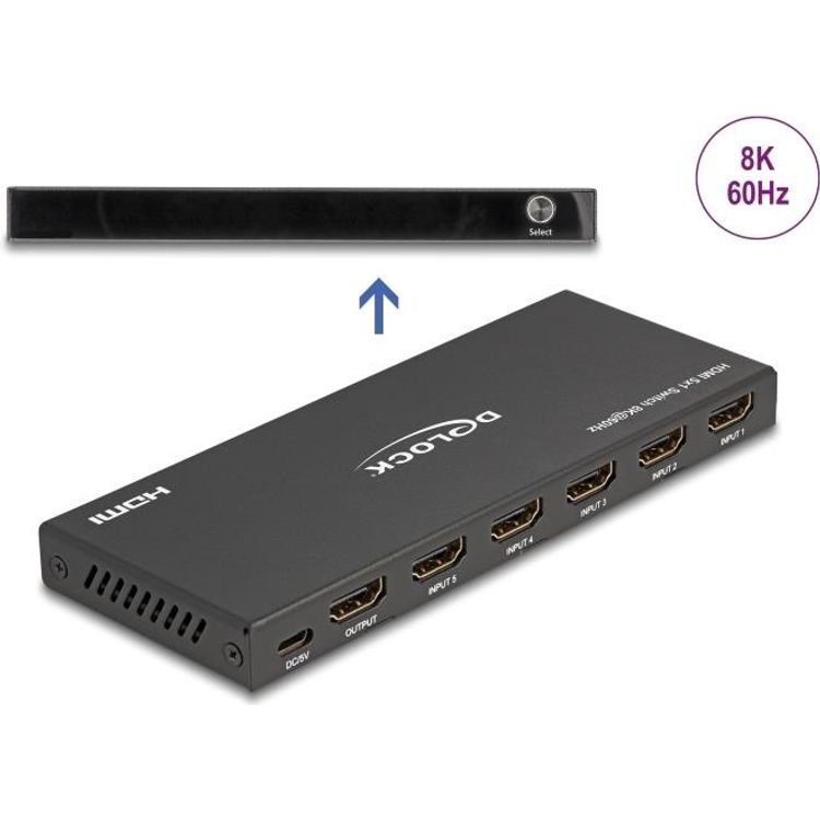 <h2 class="product_info_title">Description</h2> <p class="product_text">With this Delock HDMI switch up to five HDMI devices can be used with one HDMI monitor, TV or beamer. With the button on the device or the remote control you can switch between the HDMI devices.</p> <h2 class="product_info_title">Specification</h2> <p>• Connectors:<br /> Input:<br /> 5 x HDMI-A 19 pin female<br /> 1 x DC 5 V power connector<br /> Output:<br /> 1 x HDMI-A 19 pin female<br /> • HDMI port switching: automatic function, via button or via infrared remote control<br /> • LED indicators for active HDMI port<br /> • High Speed HDMI specification<br /> • Supports 3D displays<br /> • Supports HDCP 1.4 and 2.2<br /> • Supports HDR<br /> • Supports CEC<br /> • Supports a resolution up to 3840 x 2160 @ 60 Hz<br /> (depending on the system and the connected hardware)<br /> • Video bandwidth up to 600 MHz / 6 Gbps, 18 Gb/s max.<br /> • Power consumption: max. 2.0 W<br /> • Metal housing<br /> • Colour: black<br /> • Dimensions (LxWxH): ca. 123 x 51 x 20 mm</p>